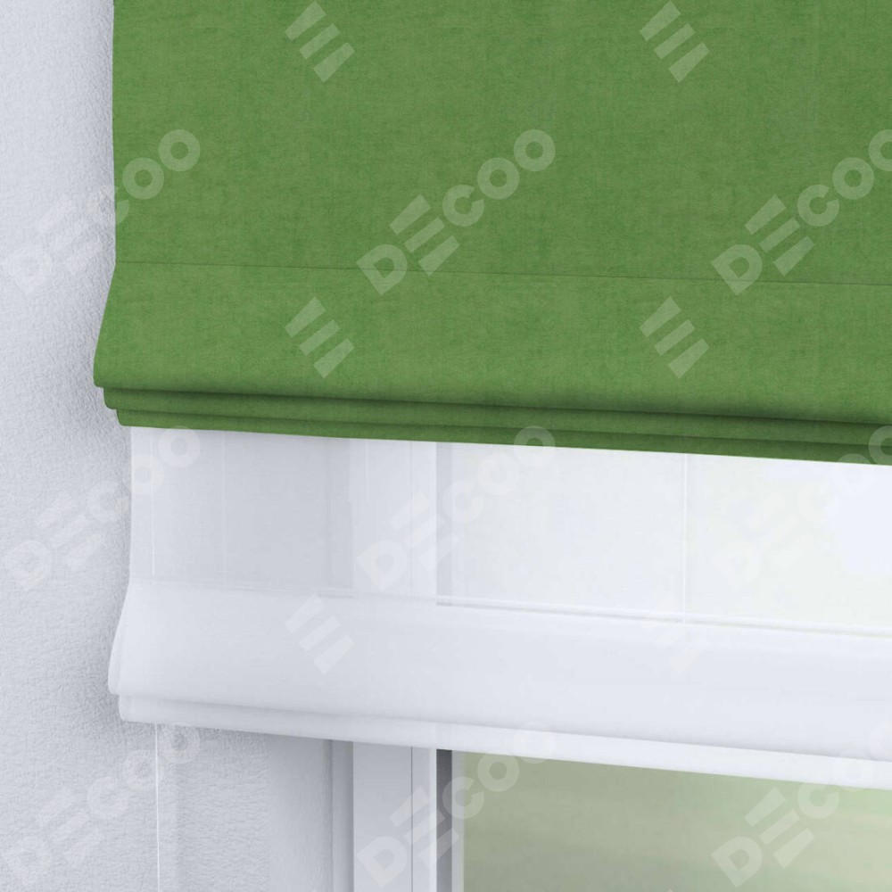 Римская штора день-ночь производителя «Cortin», используется для проёма, пошита из двух полотен, с лицевой стороны вельвет салатовый артикул 87072, вторая ткань тюль (по стандарту комплектуется тюль белого цвета артикул V-01). Имеет универсальный механизм и подходит для монтажа: на потолок, на стену и в нишу.