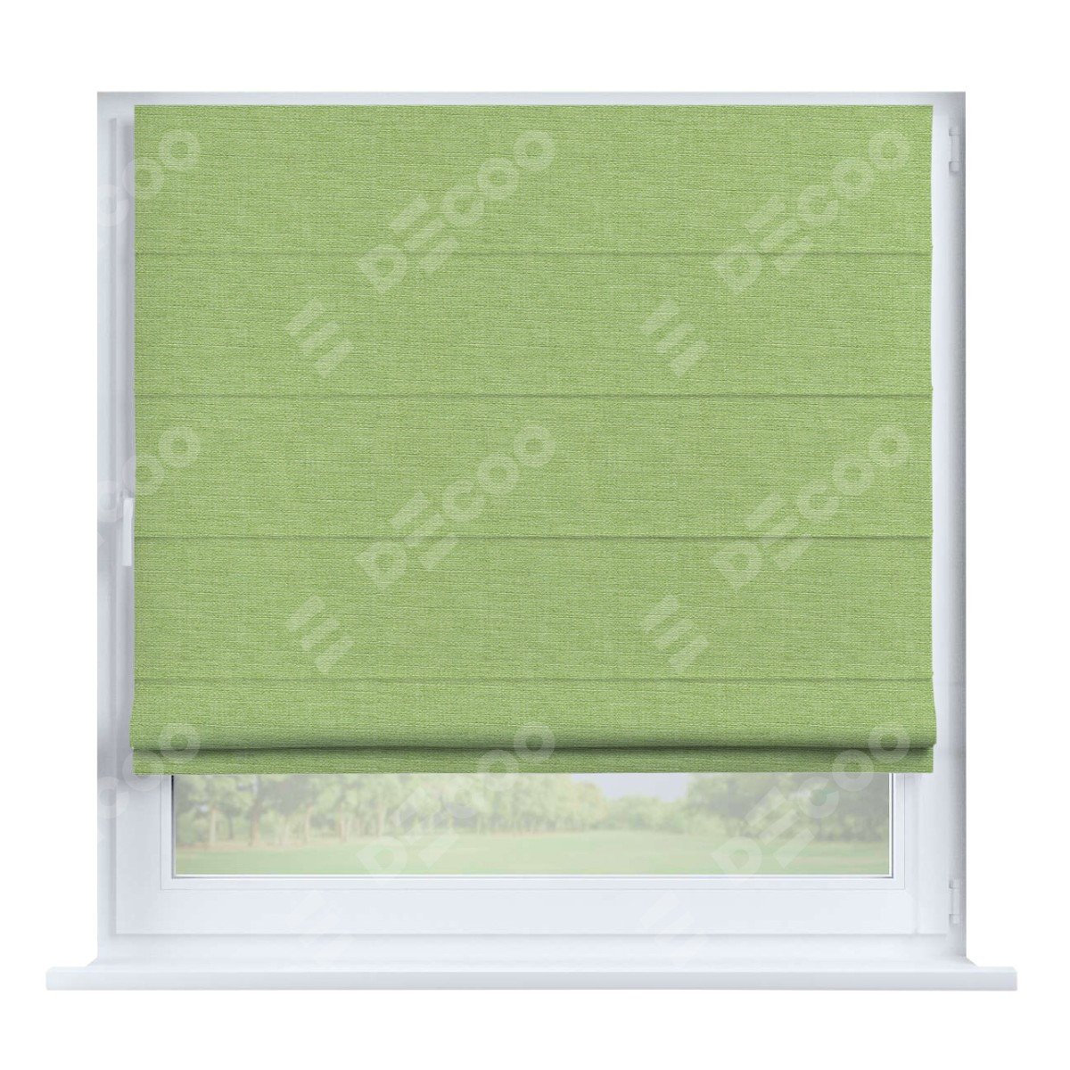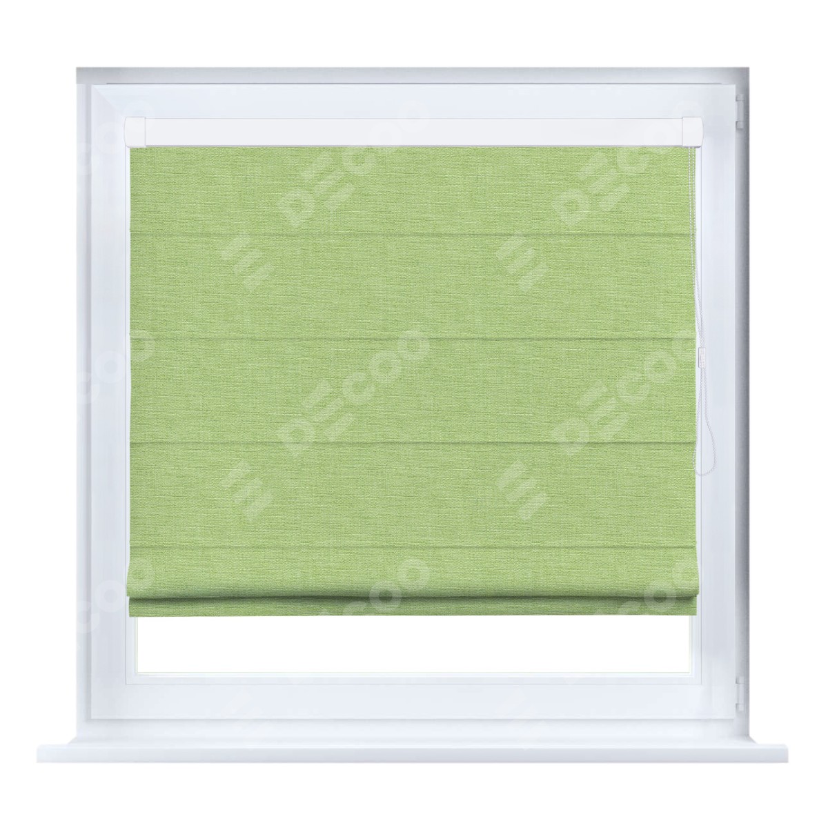 Римская штора производителя «Cortin», устанавливается на створку окна, пошита из ткани лён зелёный, артикул 85906. Штора шьётся по индивидуальным размерам, для данного типа римской шторы возможная ширина от 35 до 150 см., высота до 250 см.