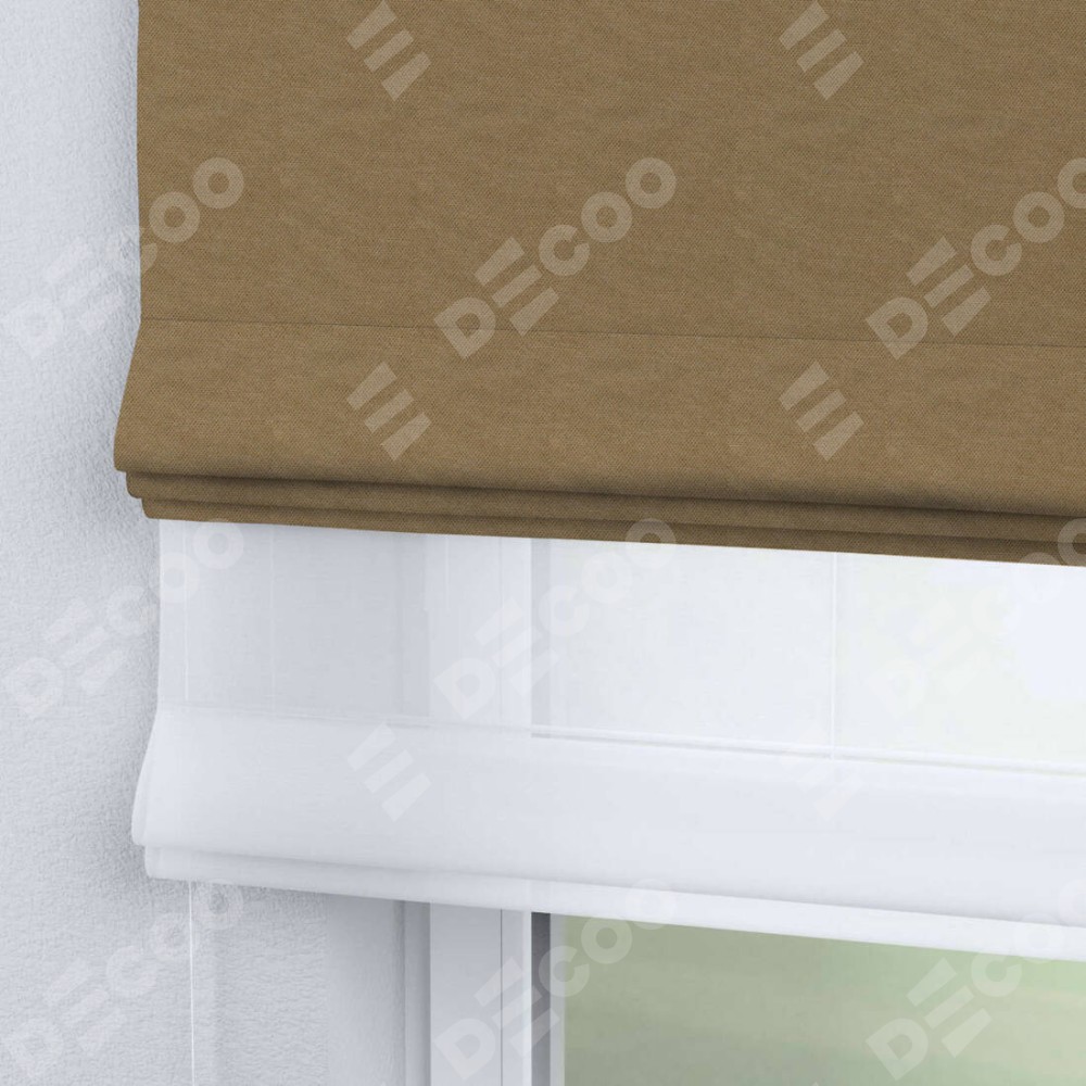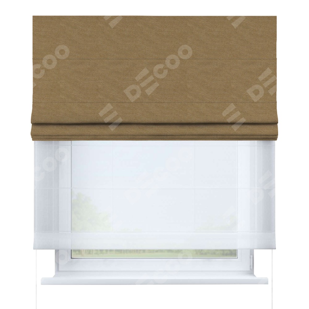 Римская штора день-ночь производителя «Cortin», используется для проёма, пошита из двух полотен, с лицевой стороны лён димаут коричневый артикул 83026, вторая ткань тюль (по стандарту комплектуется тюль белого цвета артикул V-01). Имеет универсальный механизм и подходит для монтажа: на потолок, на стену и в нишу.