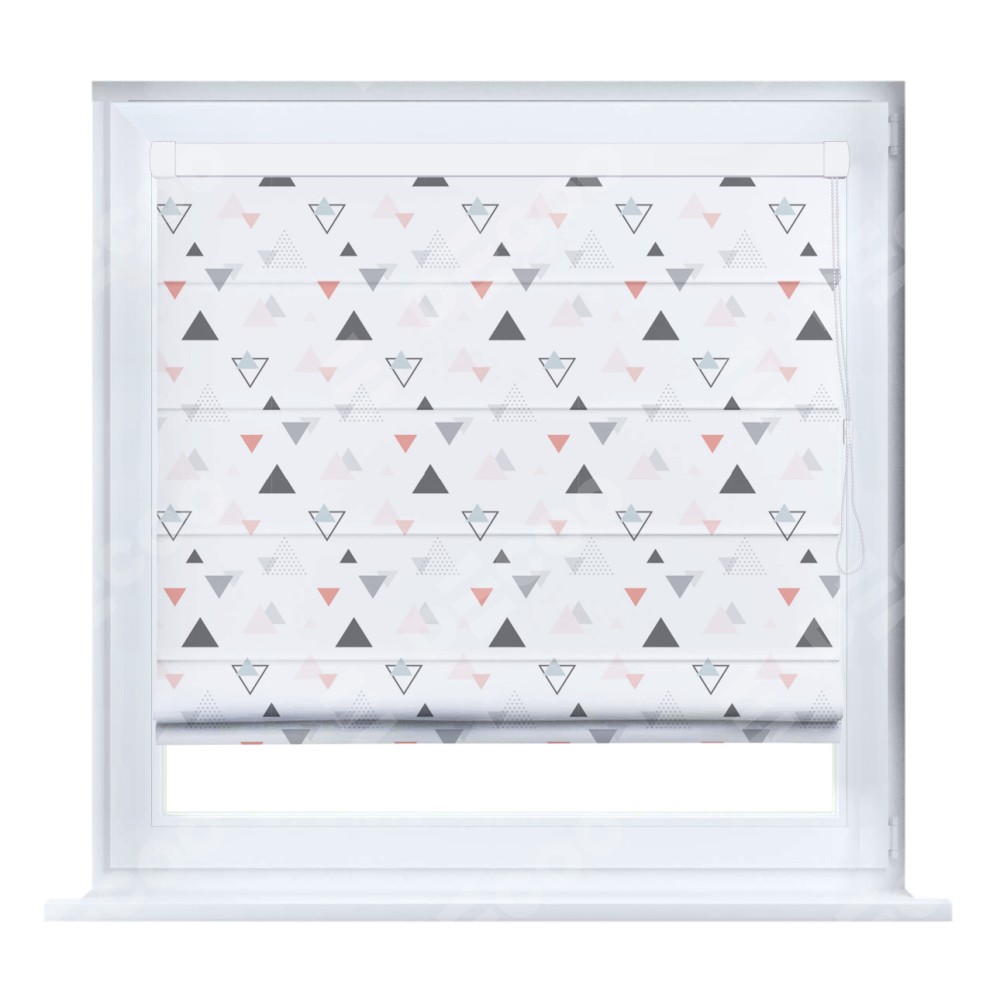 Римская штора кассетного типа, производителя «Cortin», устанавливается только на пластиковые окна и прилегает к стеклопакету, пошита из ткани блэкаут с нанесением сублимационной печати «Дождь из треугольников».