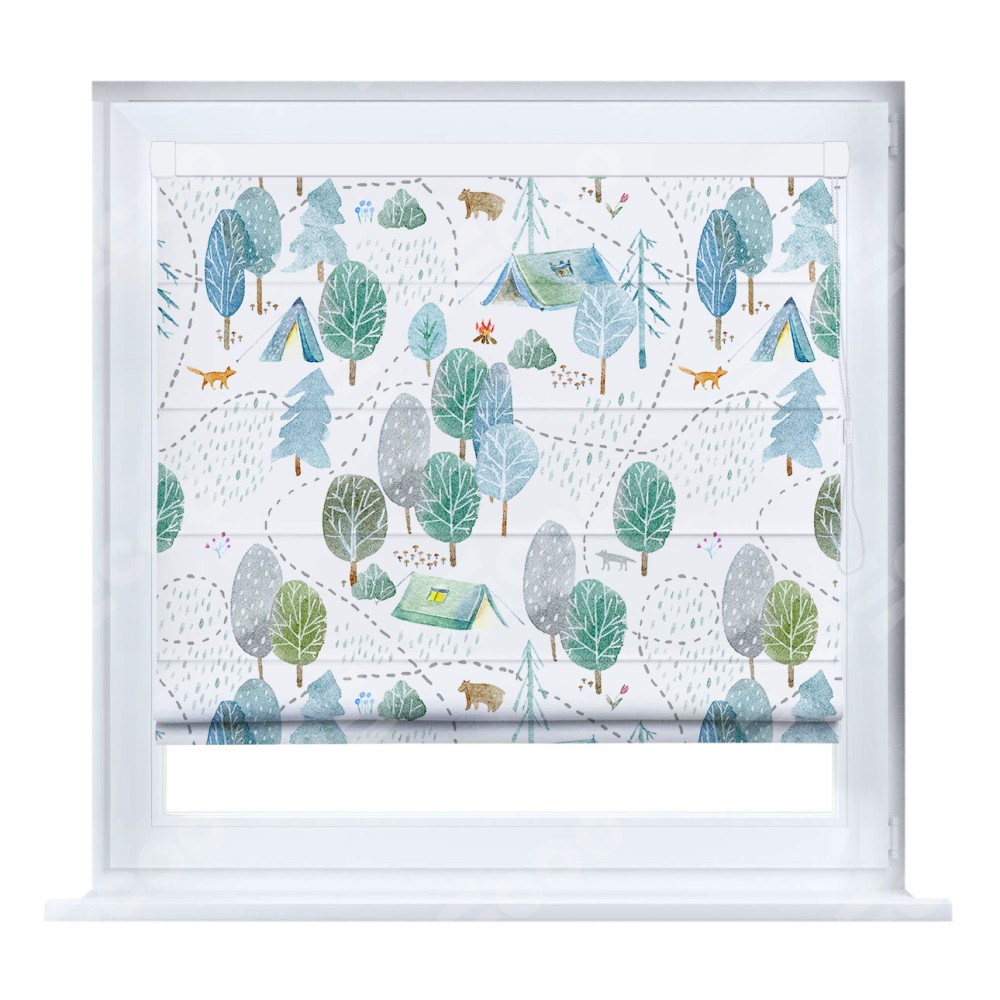 Римская штора кассетного типа, производителя «Cortin», устанавливается только на пластиковые окна и прилегает к стеклопакету, пошита из ткани блэкаут с нанесением сублимационной печати «Лесистая местность».