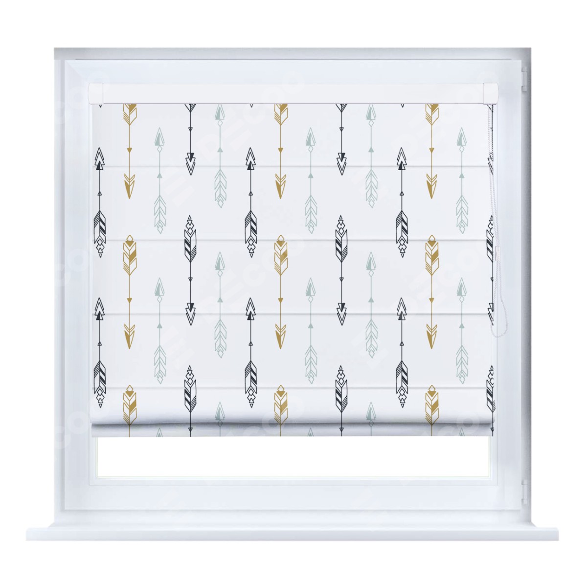 Римская штора кассетного типа, производителя «Cortin», устанавливается только на пластиковые окна и прилегает к стеклопакету, пошита из ткани блэкаут с нанесением сублимационной печати «Любимые стрелки».