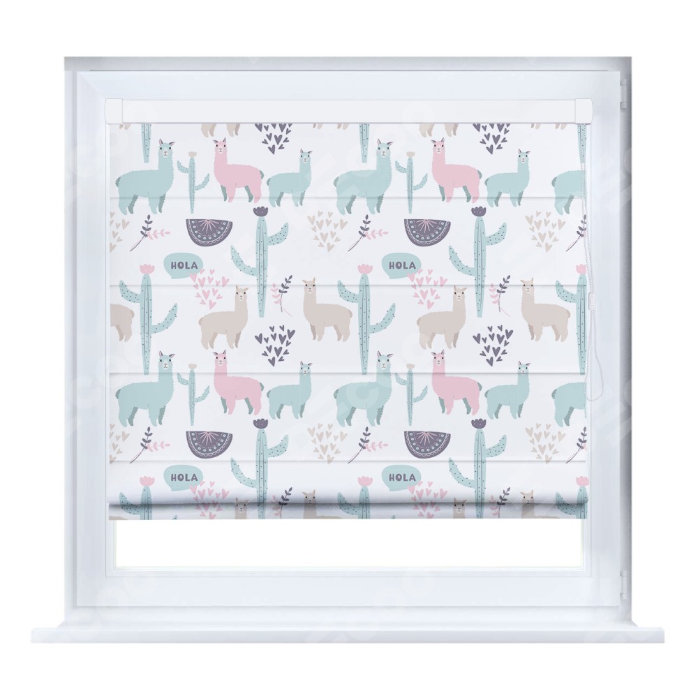 Римская штора производителя «Cortin», устанавливается на створку окна, пошита из ткани блэкаут с нанесением сублимационной печати «Милый лама». Штора шьётся по индивидуальным размерам, для данного типа римской шторы возможная ширина от 35 до 150 см., высота до 250 см.