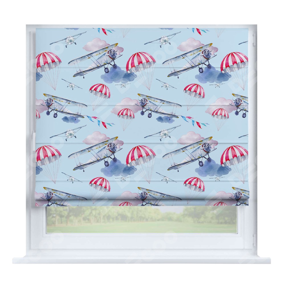 Римская штора производителя «Cortin», устанавливается на створку окна, пошита из ткани блэкаут с нанесением сублимационной печати «Самолёт». Штора шьётся по индивидуальным размерам, для данного типа римской шторы возможная ширина от 35 до 150 см., высота до 250 см.