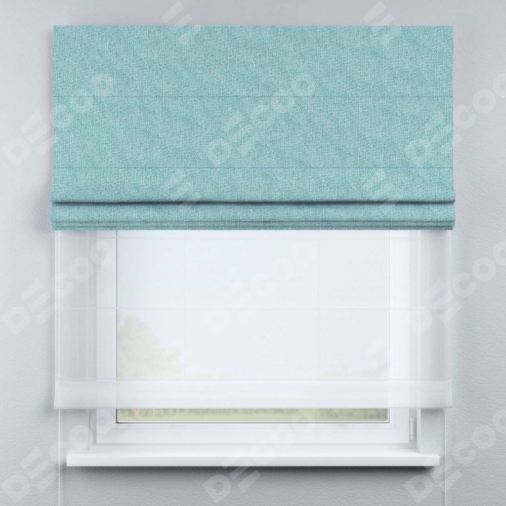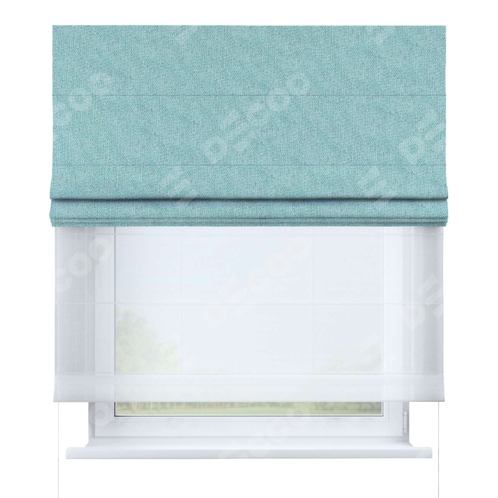 Римская штора день-ночь производителя «Cortin», используется для проёма, пошита из двух полотен, с лицевой стороны лён димаут бирюзовый артикул 23, вторая ткань тюль (по стандарту комплектуется тюль белого цвета артикул V-01). Имеет универсальный механизм и подходит для монтажа: на потолок, на стену и в нишу.