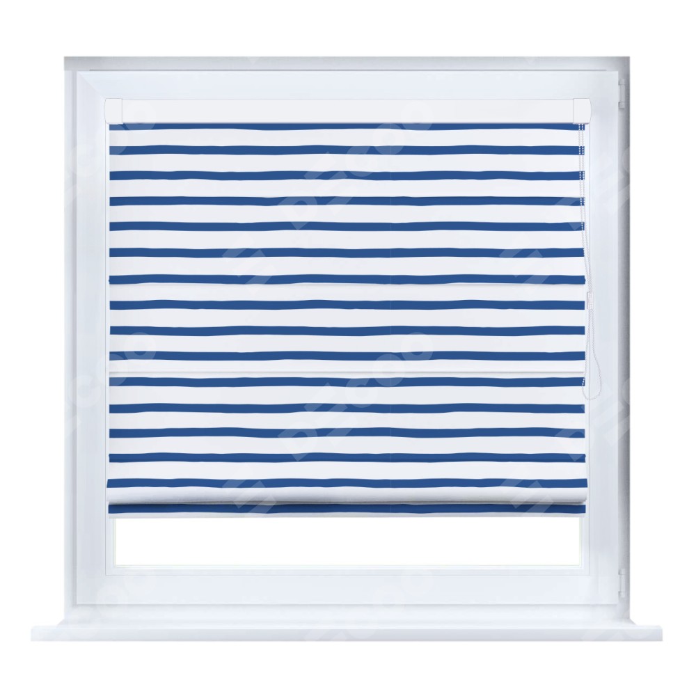 Римская штора кассетного типа, производителя «Cortin», устанавливается только на пластиковые окна и прилегает к стеклопакету, пошита из ткани блэкаут с нанесением сублимационной печати «Морская полоска».