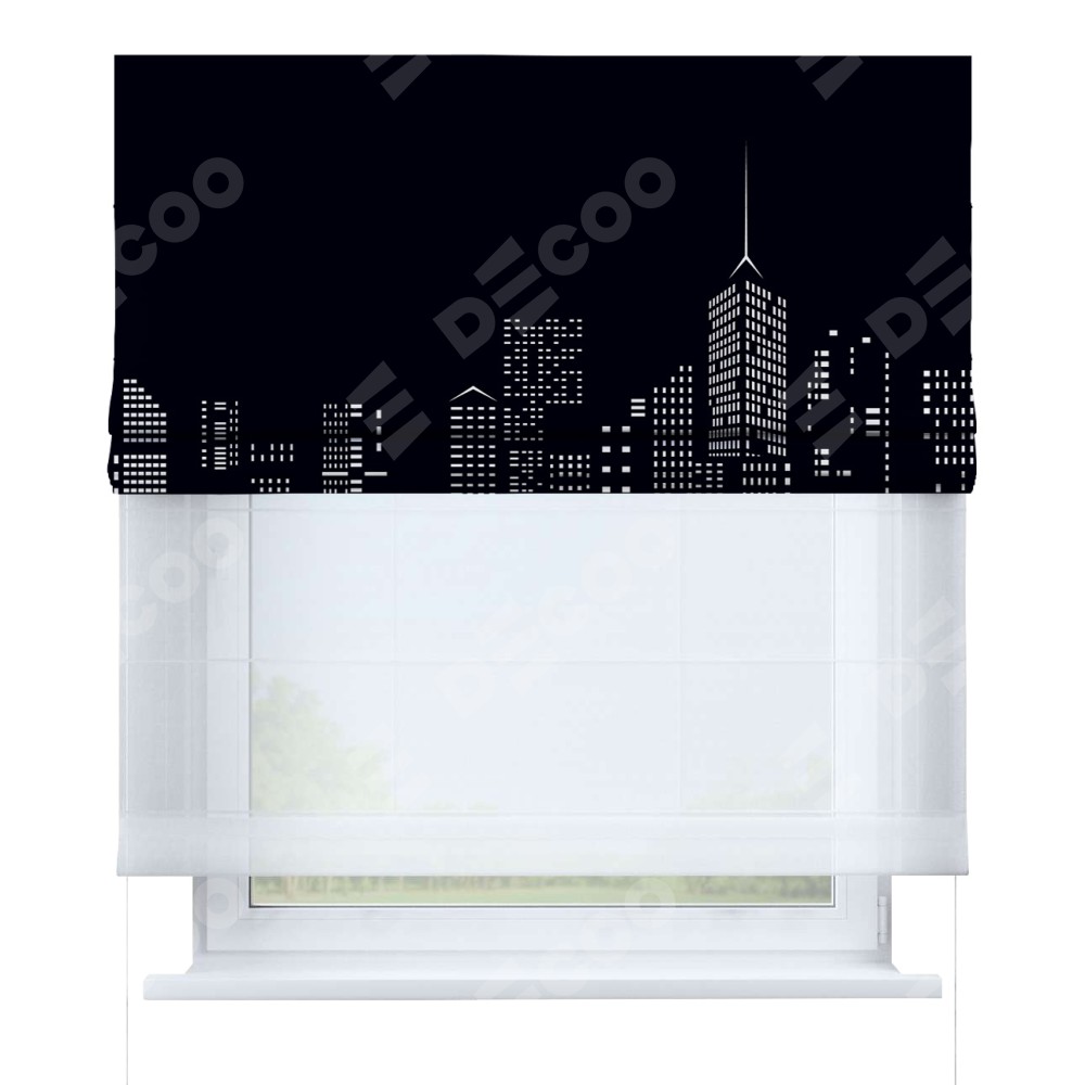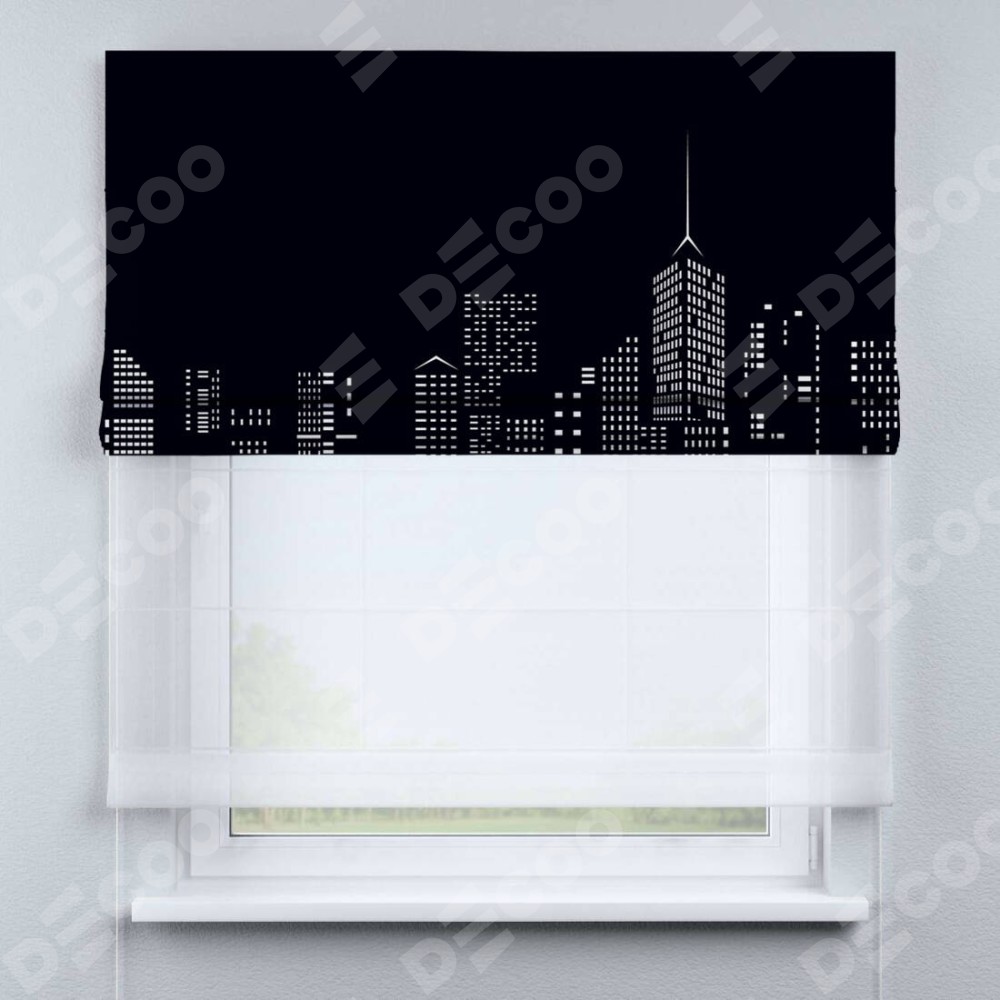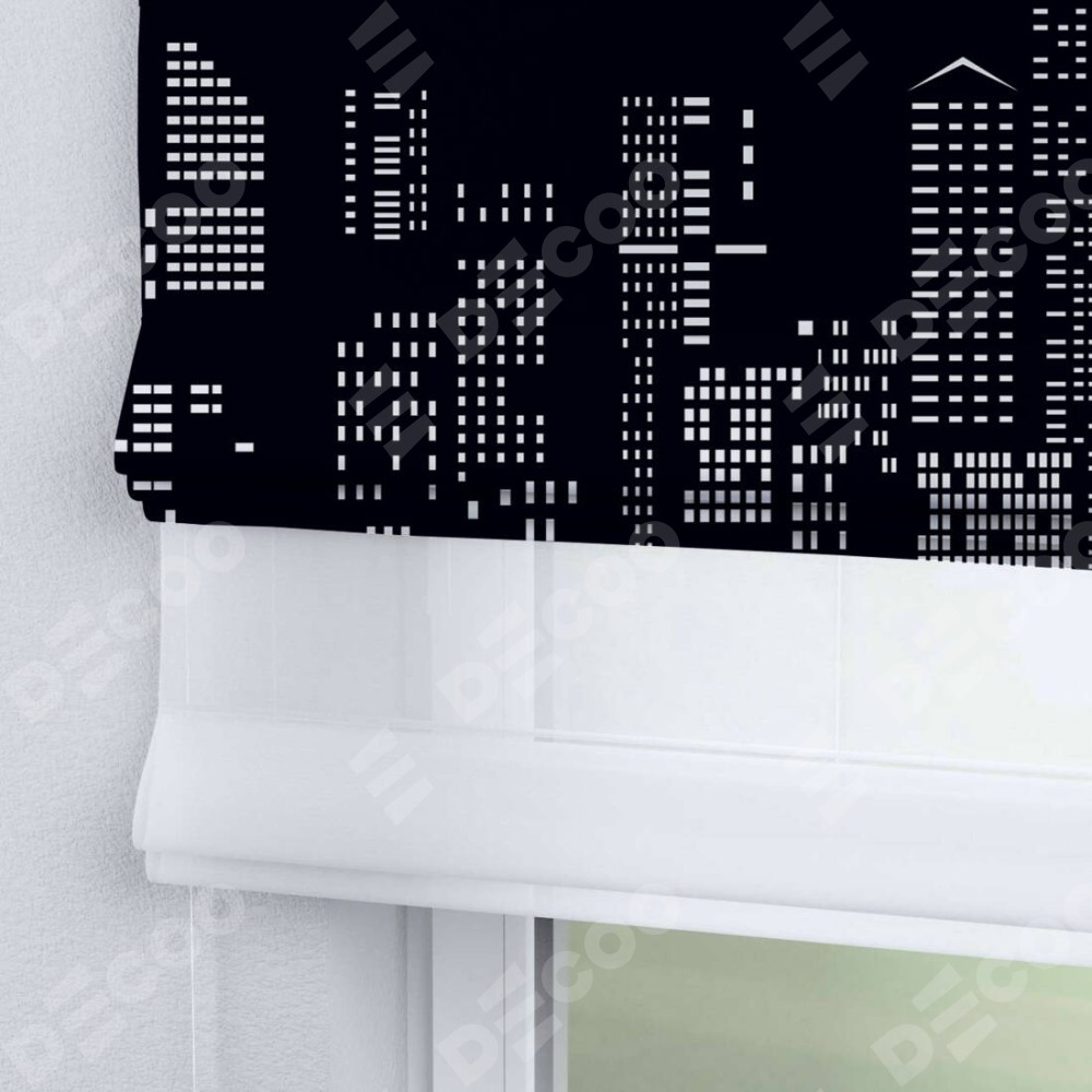 Римская штора день-ночь производителя «Cortin», используется для проёма, пошита из двух полотен, с лицевой блэкаут с нанесением сублимационной печати «Ночной город», вторая ткань тюль (по стандарту комплектуется тюль белого цвета артикул V-01). Имеет универсальный механизм и подходит для монтажа: на потолок, на стену и в нишу.