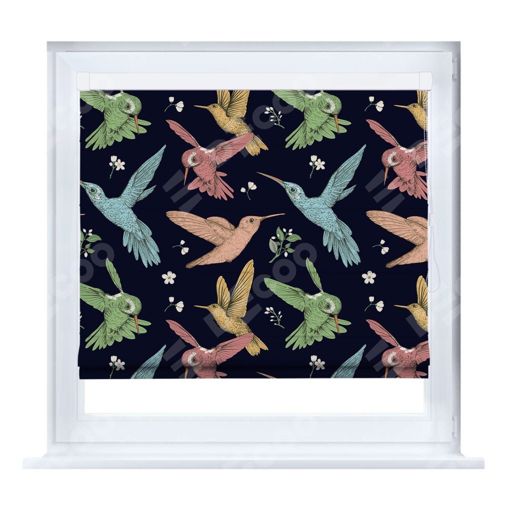 Римская штора кассетного типа, производителя «Cortin», устанавливается только на пластиковые окна и прилегает к стеклопакету, пошита из ткани блэкаут с нанесением сублимационной печати «Птицы и цветы».