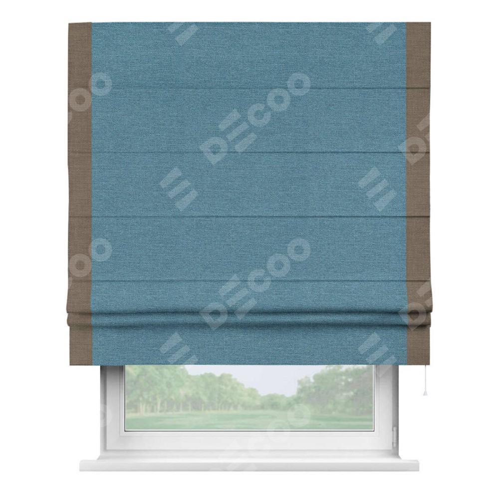 Римская штора производителя «Cortin», используется для проёма, пошита из ткани лён голубой, артикул 63741. Отделка шторы кантом «Стрим Дуо», ткань для канта используется из льна разной расцветки на выбор. Имеет универсальный механизм и подходит для монтажа: на потолок, на стену и в нишу.