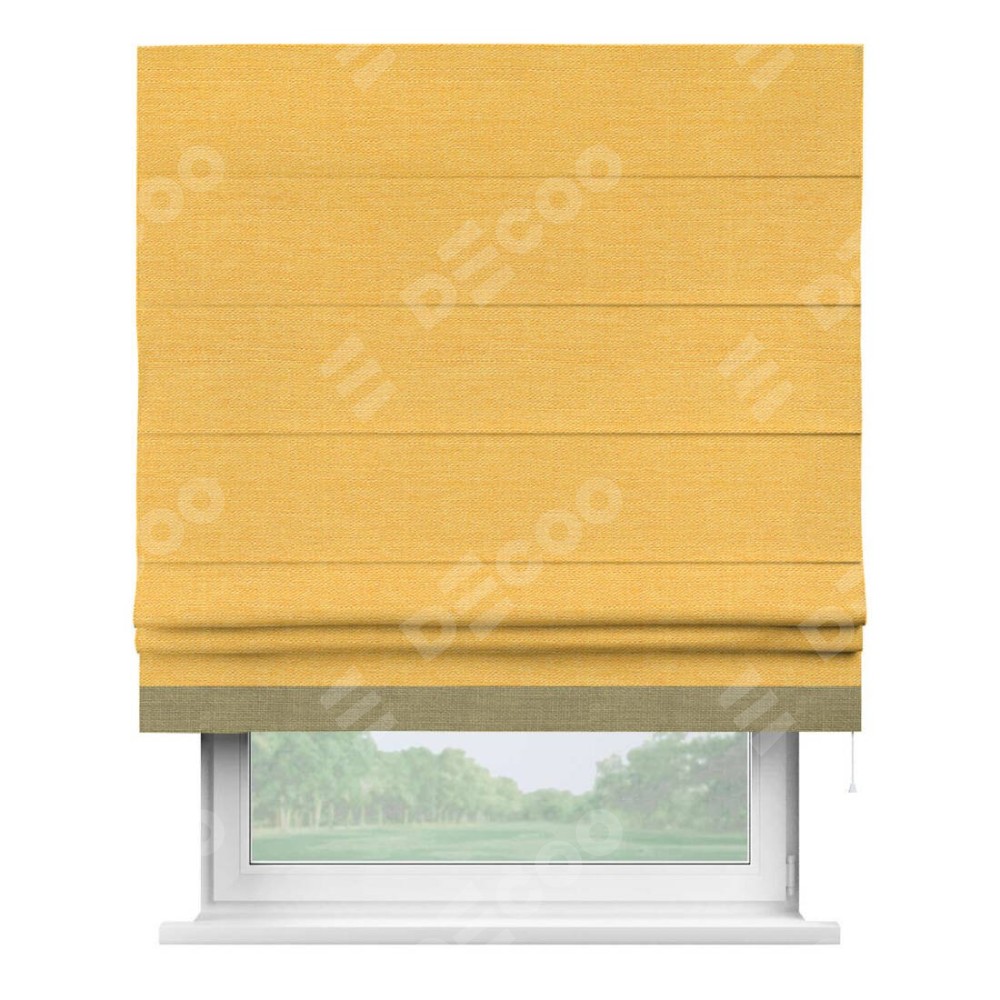 Римская штора производителя «Cortin», используется для проёма, пошита из ткани лён желтый, артикул 63738. Отделка шторы кантом «Джестер», ткань для канта используется из льна разной расцветки на выбор. Имеет универсальный механизм и подходит для монтажа: на потолок, на стену и в нишу.