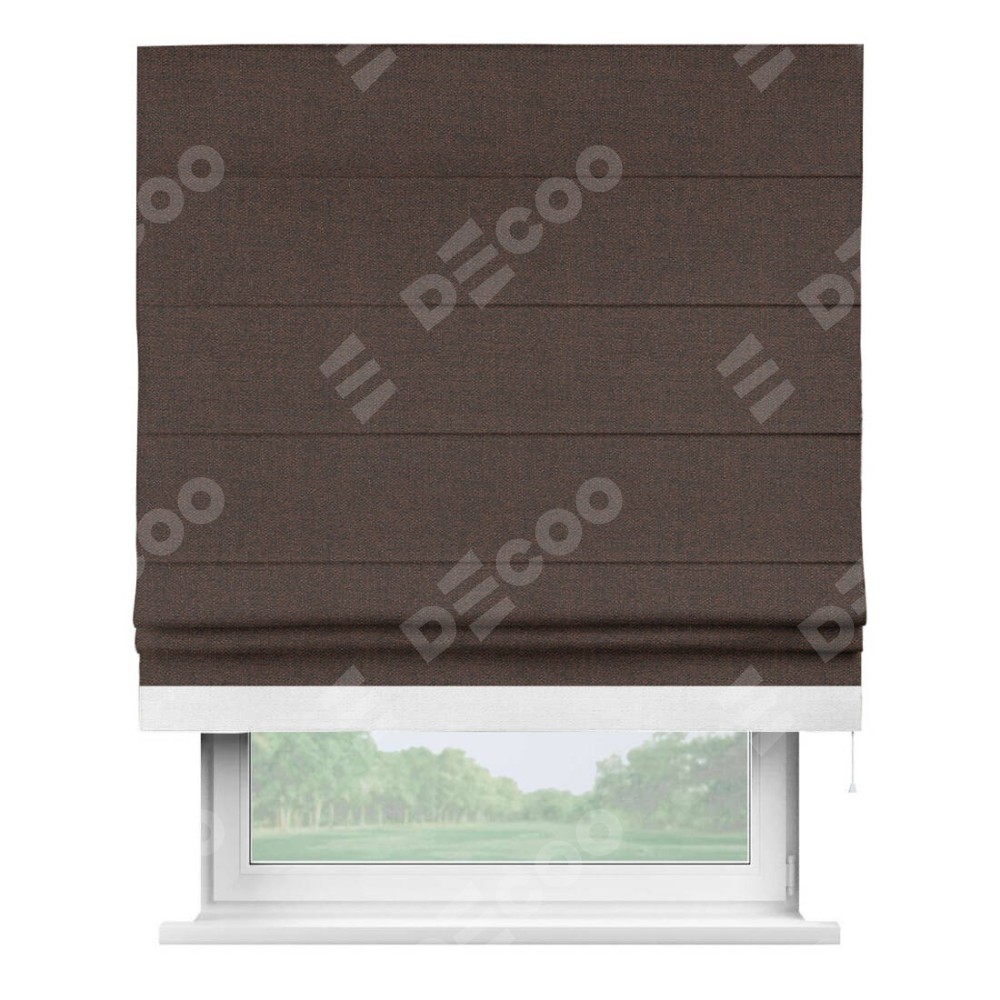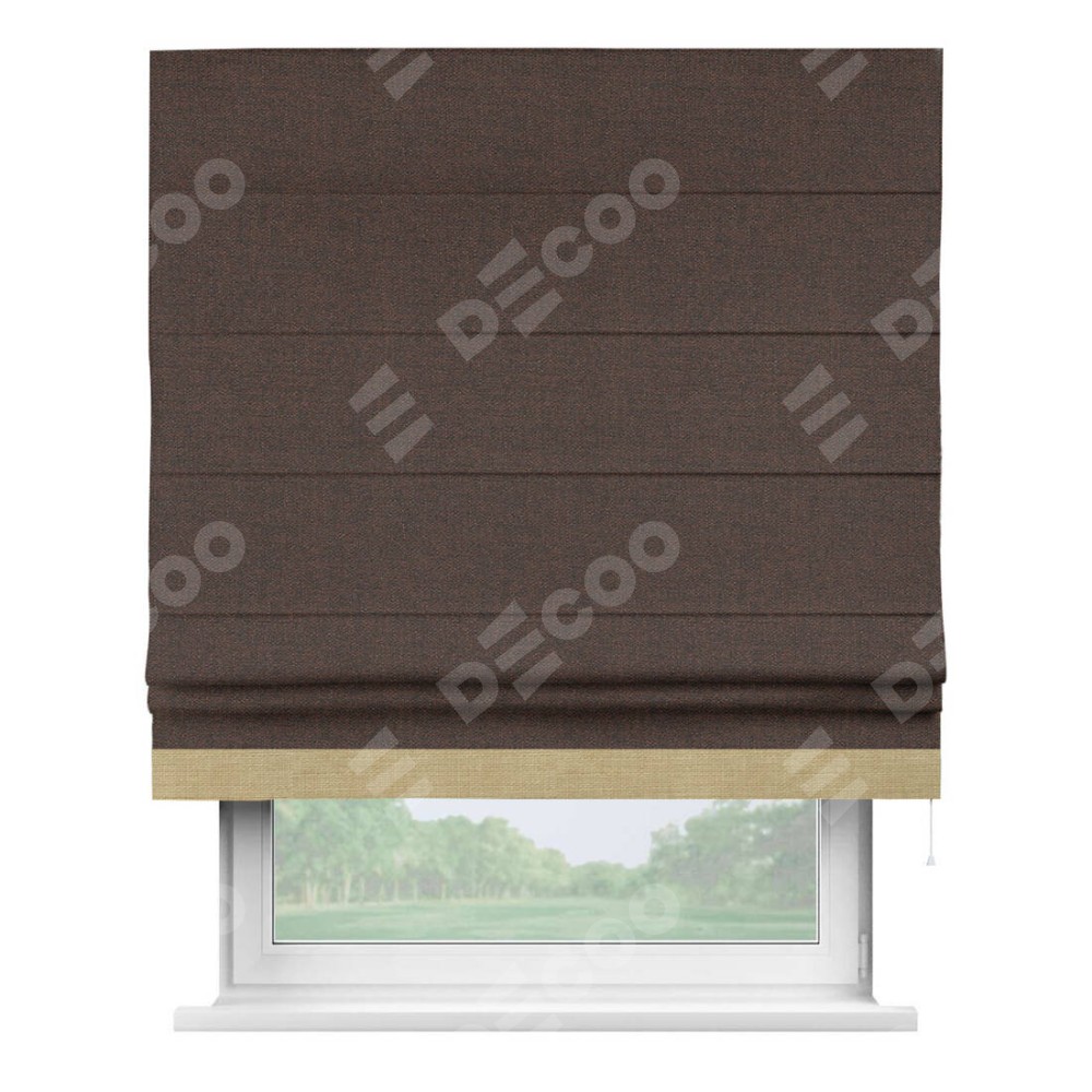 Римская штора производителя «Cortin», используется для проёма, пошита из ткани лён коричневый, артикул 53443. Отделка шторы кантом «Джестер», ткань для канта используется из льна разной расцветки на выбор. Имеет универсальный механизм и подходит для монтажа: на потолок, на стену и в нишу.