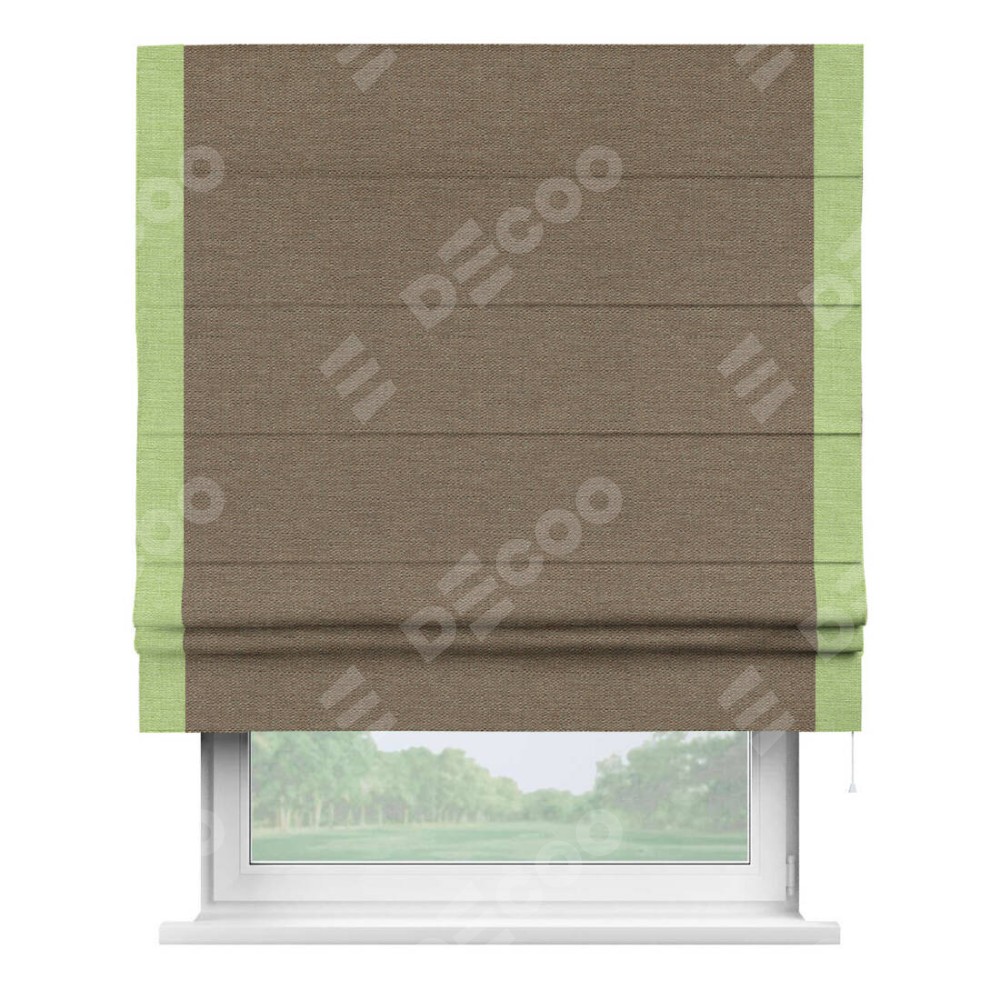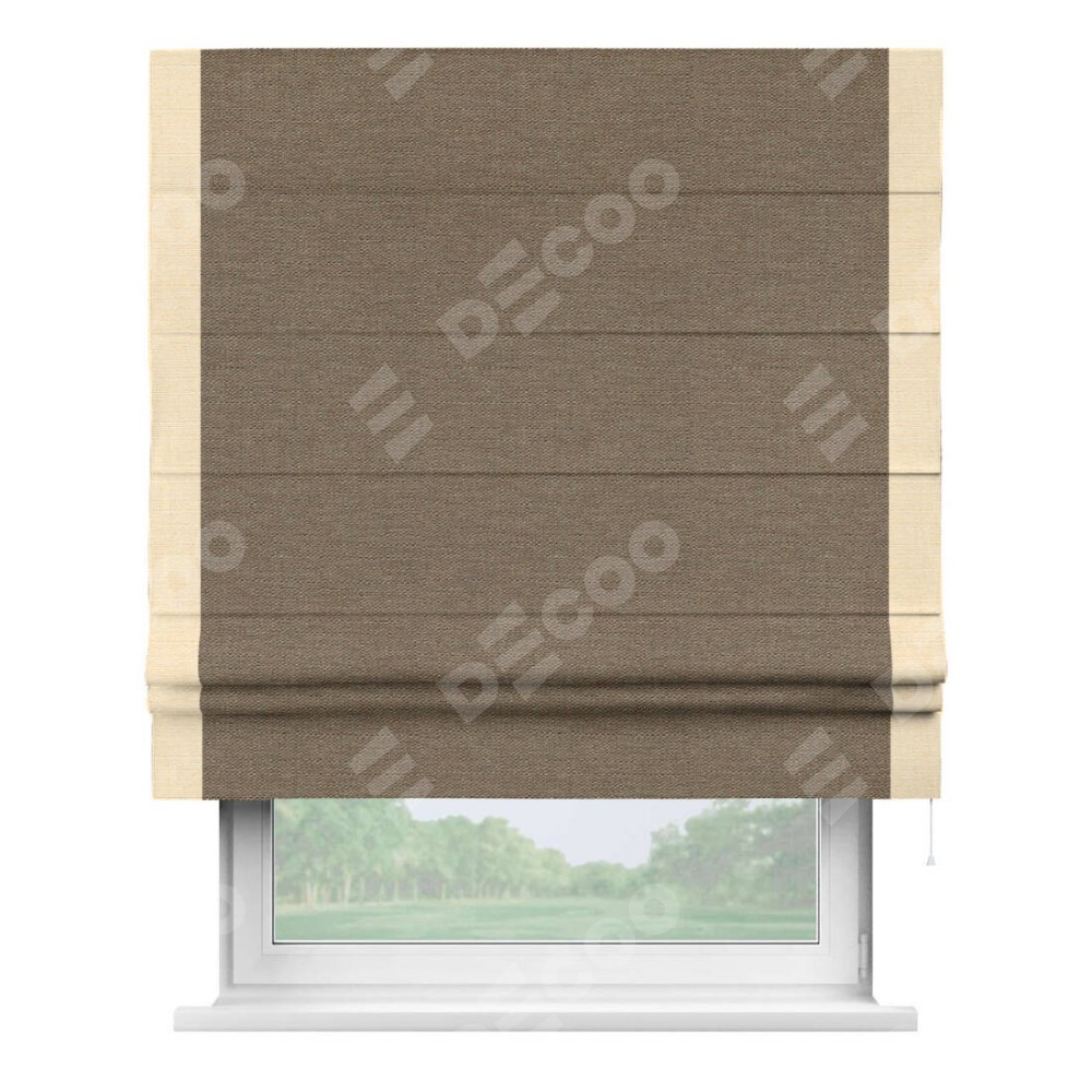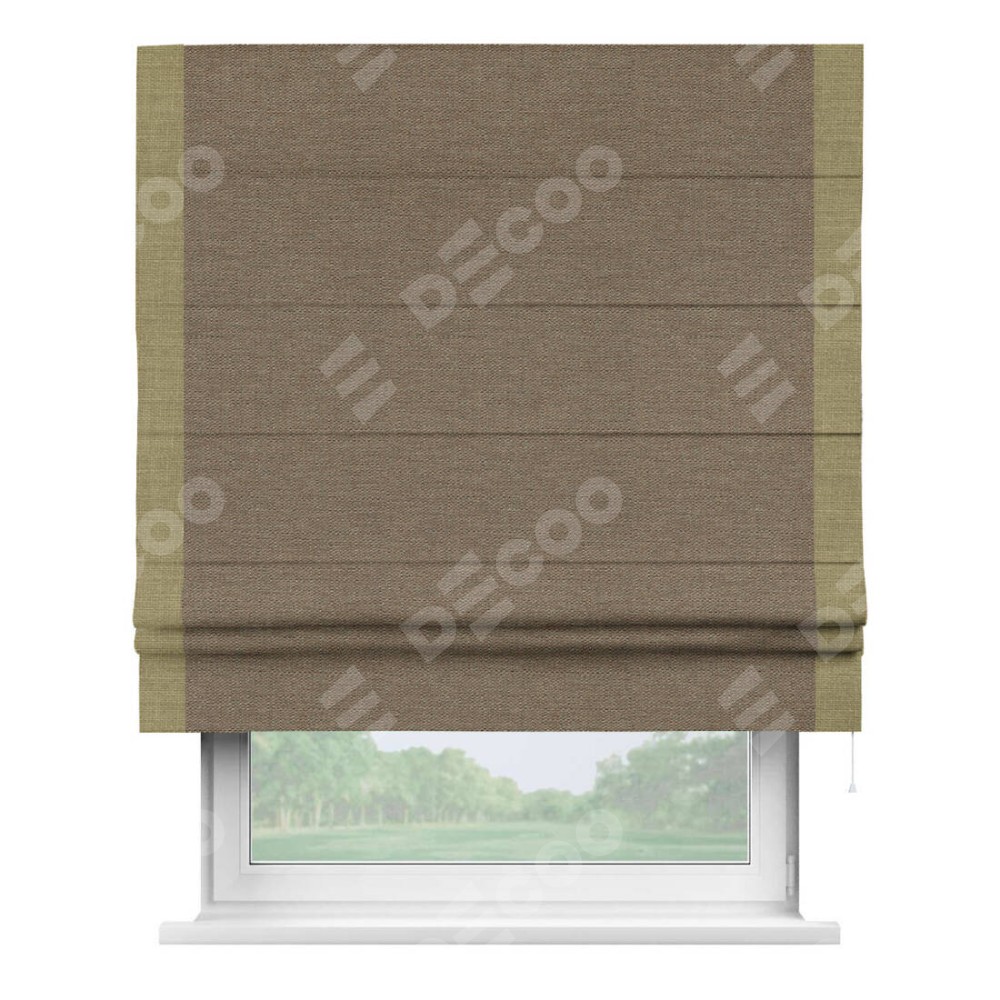 Римская штора производителя «Cortin», используется для проёма, пошита из ткани лён светло-коричневый, артикул 53434. Отделка шторы кантом «Стрим Дуо», ткань для канта используется из льна разной расцветки на выбор. Имеет универсальный механизм и подходит для монтажа: на потолок, на стену и в нишу.