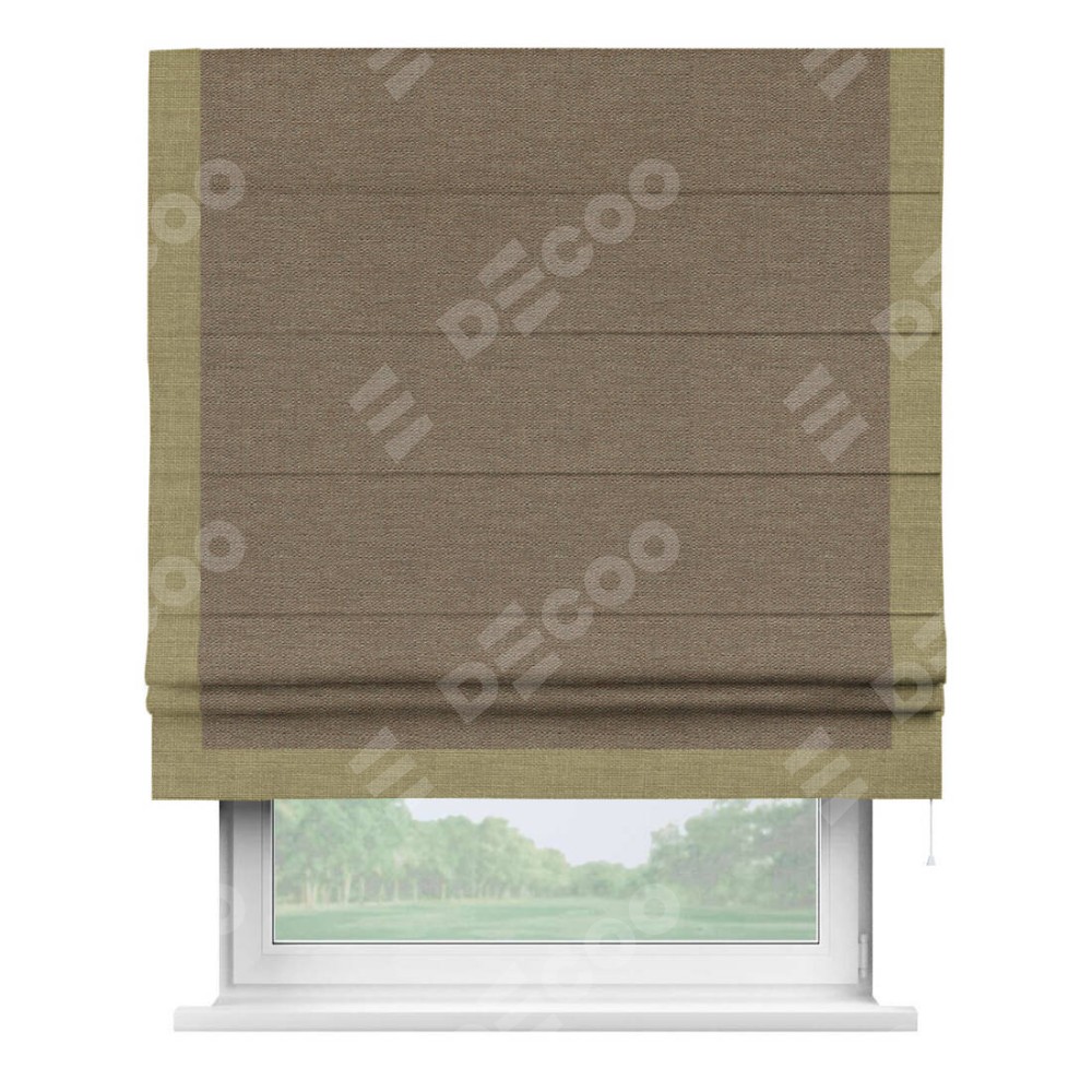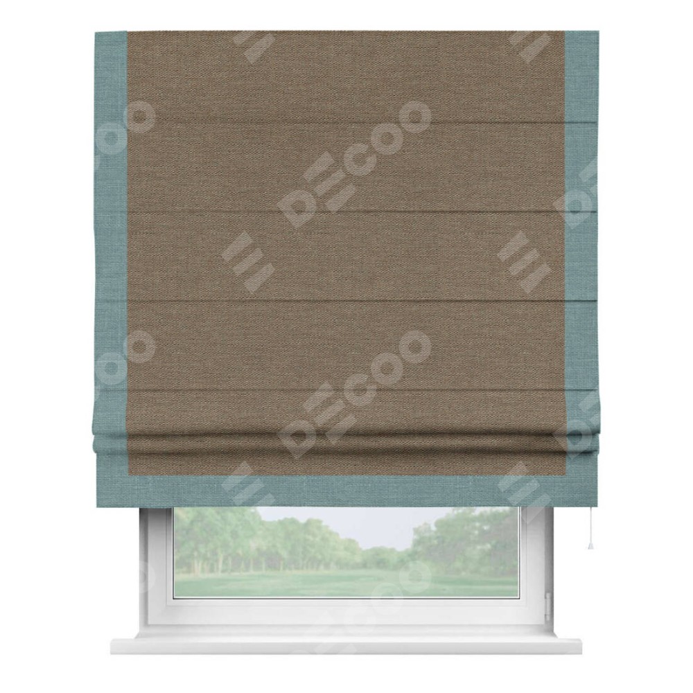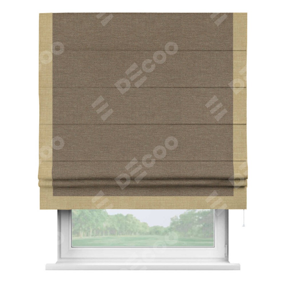 Римская штора производителя «Cortin», используется для проёма, пошита из ткани лён светло-коричневый, артикул 53434. Отделка шторы кантом «Виктория», ткань для канта используется из льна разной расцветки на выбор. Имеет универсальный механизм и подходит для монтажа: на потолок, на стену и в нишу.