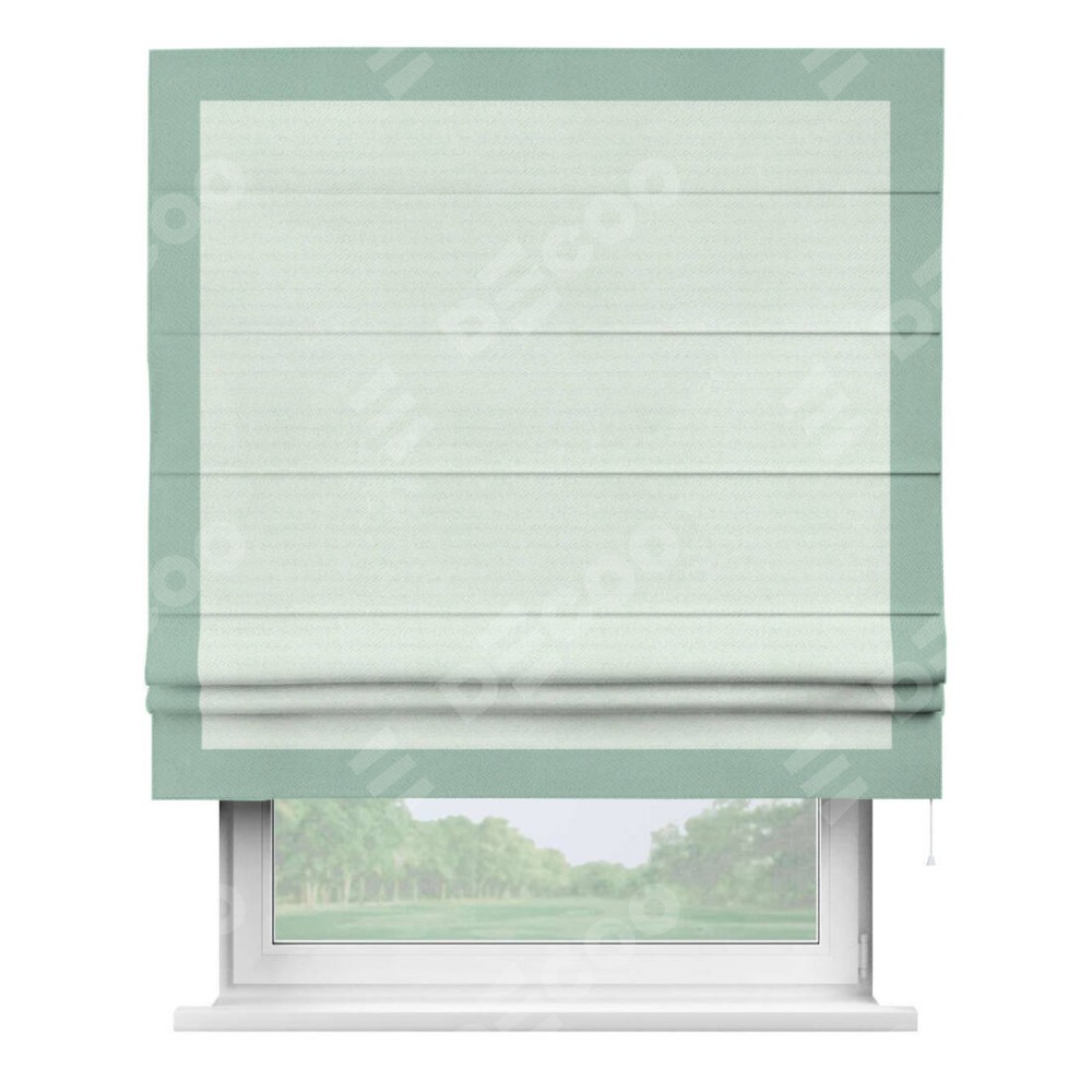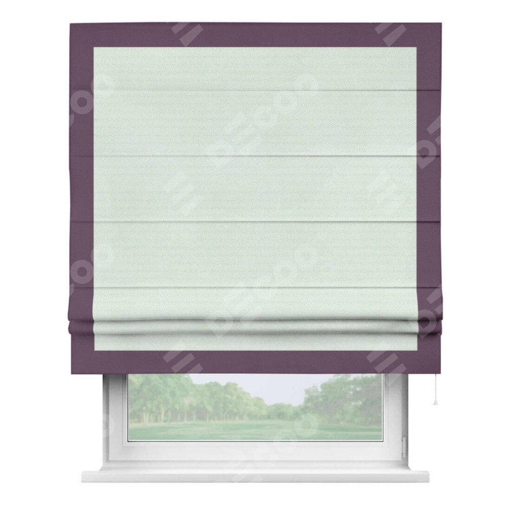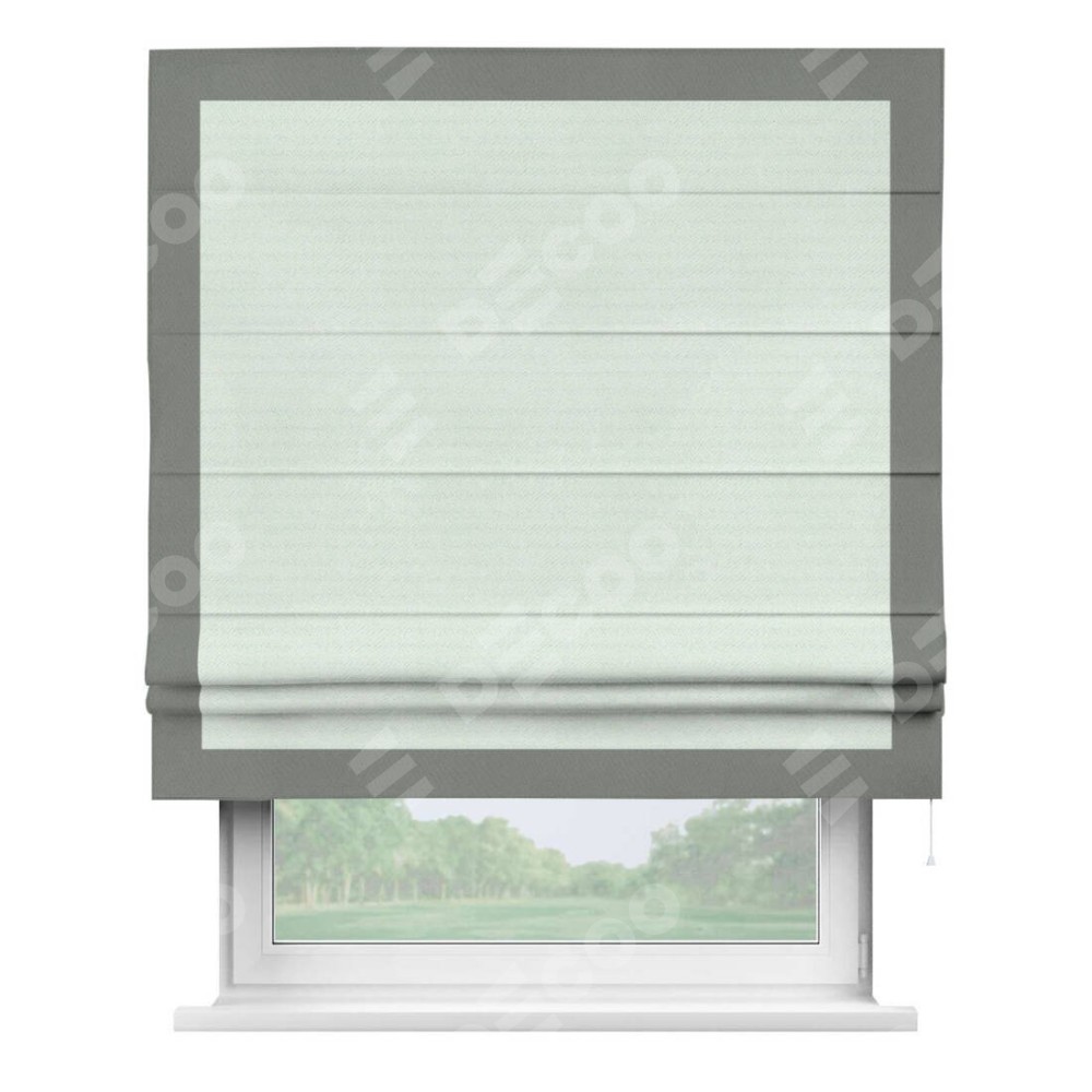 Римская штора производителя «Cortin», используется для проёма, пошита из ткани блэкаут однотонный дымчато-молочный, артикул ткани 88282. Отделка шторы кантом «Чесс», ткань для канта используется из блэкаута однотонного разной расцветки на выбор. Имеет универсальный механизм и подходит для монтажа: на потолок, на стену и в нишу.