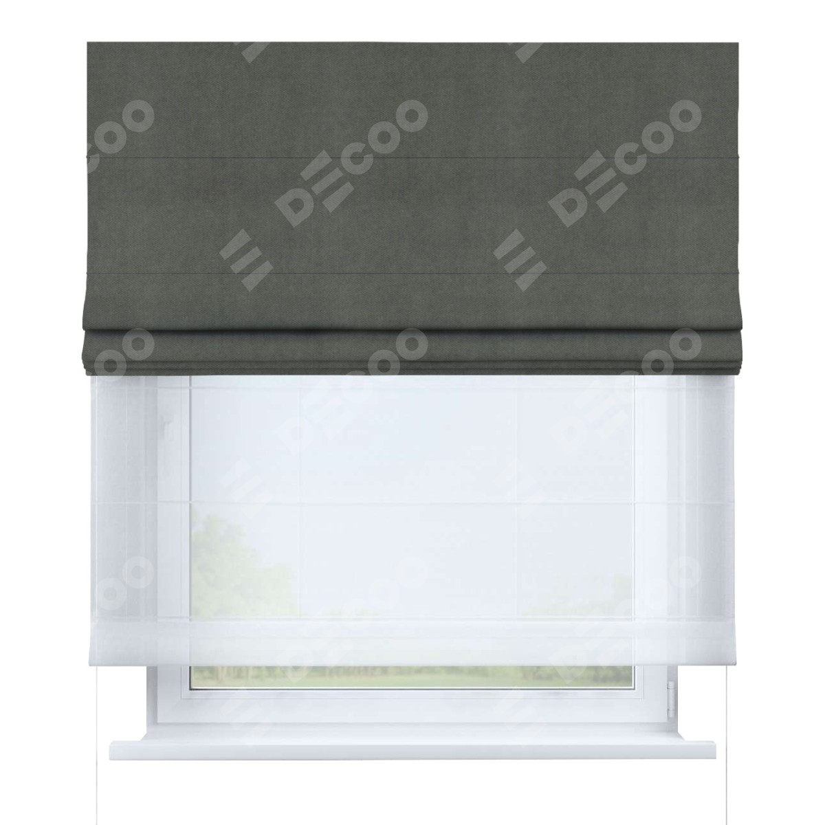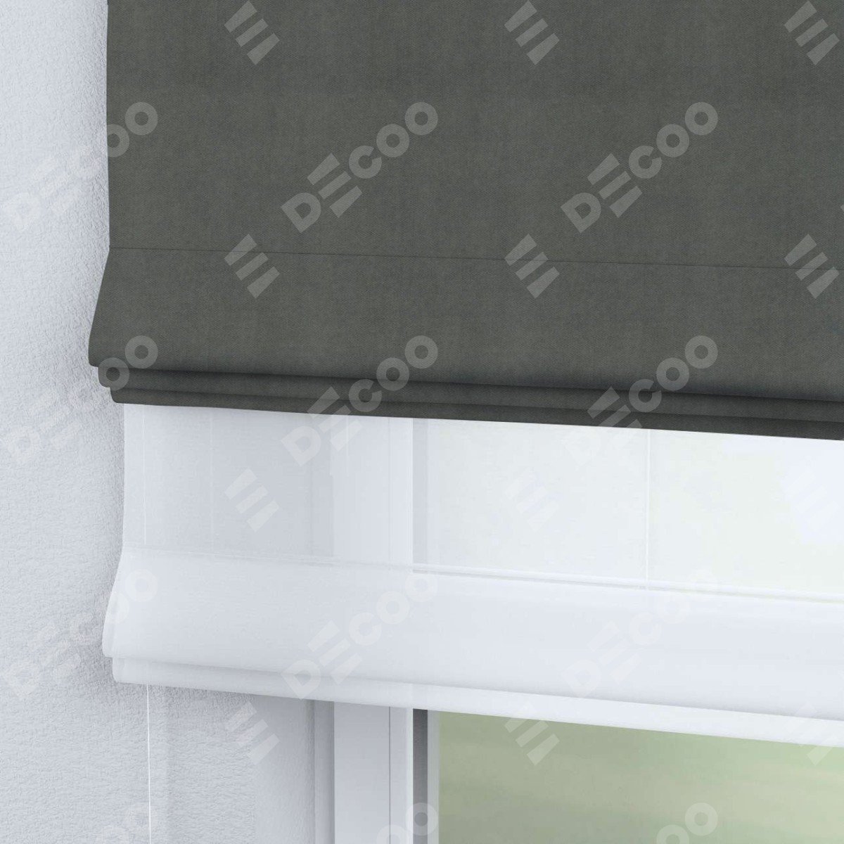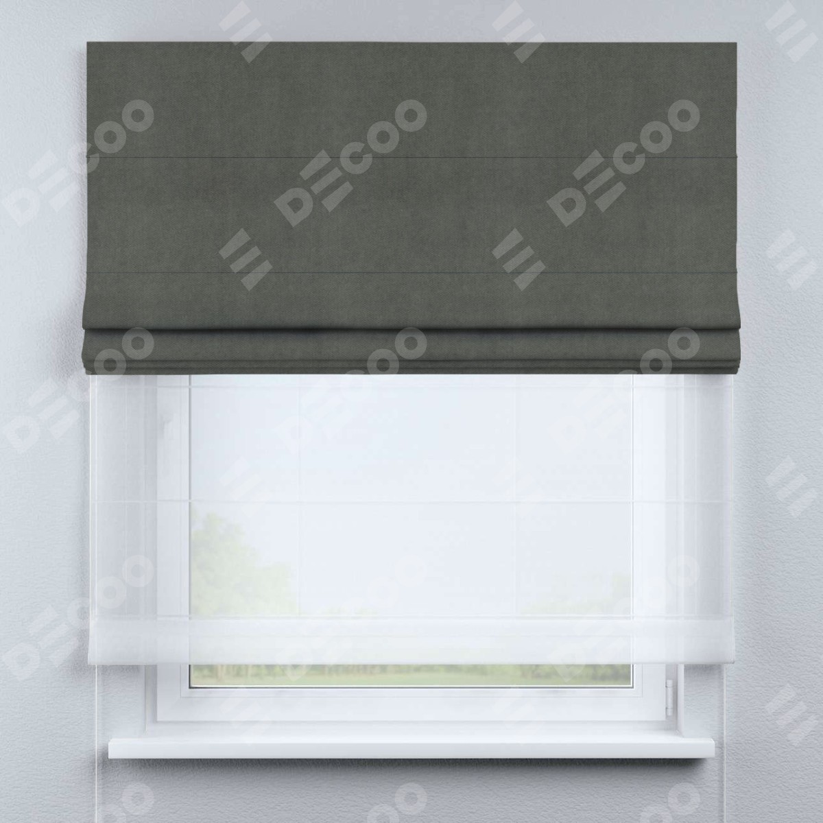 Римская штора день-ночь производителя «Cortin», используется для проёма, пошита из двух полотен, с лицевой стороны вельвет тёмно-серый артикул 85542, вторая ткань тюль (по стандарту комплектуется тюль белого цвета артикул V-01). Имеет универсальный механизм и подходит для монтажа: на потолок, на стену и в нишу.