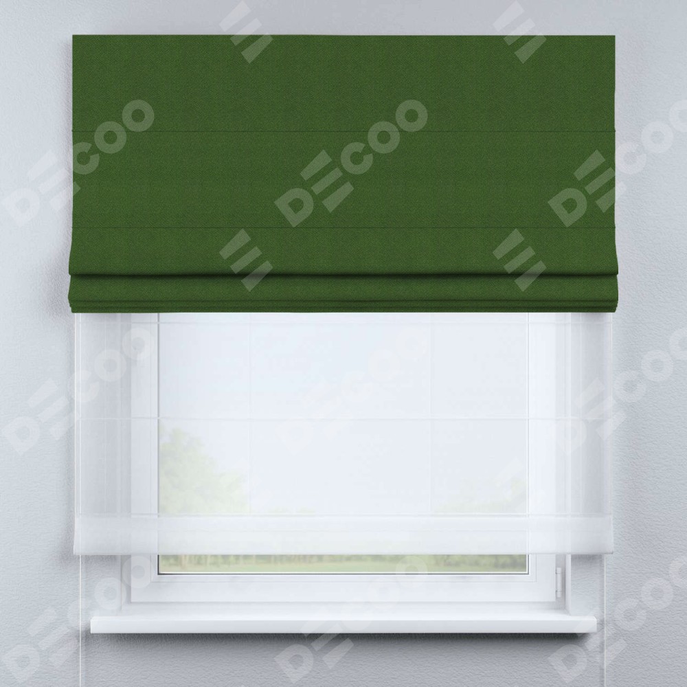Римская штора день-ночь производителя «Cortin», используется для проёма, пошита из двух полотен, с лицевой стороны блэкаут однотонный зелёный перламутр артикул 81859п, вторая ткань тюль (по стандарту комплектуется тюль белого цвета артикул V-01). Имеет универсальный механизм и подходит для монтажа: на потолок, на стену и в нишу.