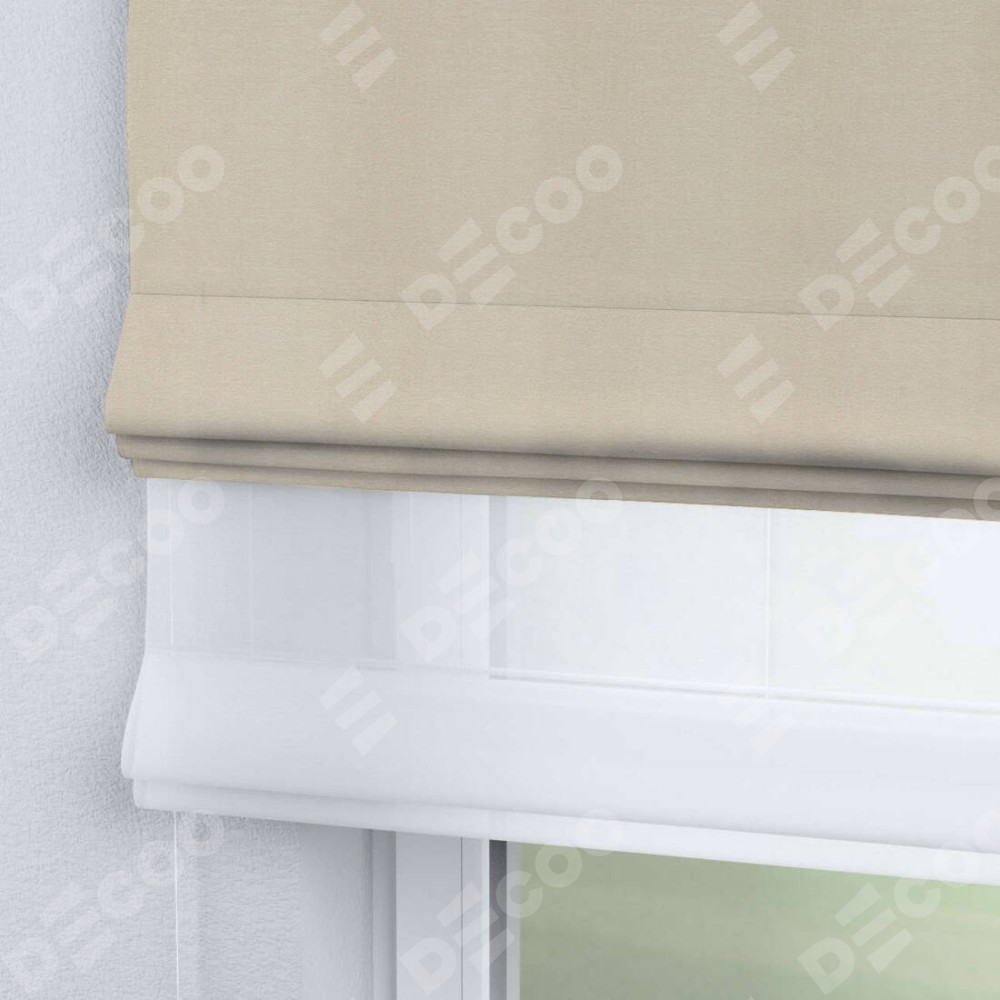 Римская штора день-ночь производителя «Cortin», используется для проёма, пошита из двух полотен, с лицевой стороны софт однотонный бежевый лайт артикул 33100, вторая ткань тюль (по стандарту комплектуется тюль белого цвета артикул V-01). Имеет универсальный механизм и подходит для монтажа: на потолок, на стену и в нишу.