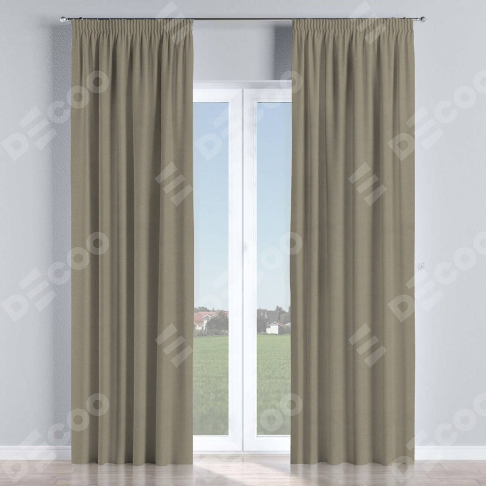 Комплект прямых штор, от производителя «Cortin», пошиты из ткани блэкаут однотонный бежево-серый, артикул ткани 00004. С изнаночной стороны в верхней части штор пристрачивается шторная лента с декоративными складками «Карандаш». Для создания элегантных складок прямые шторы шьются по стандарту с коэффициентом 1:2 (на 100 см. ширины проёма 200 см. ширины ткани).