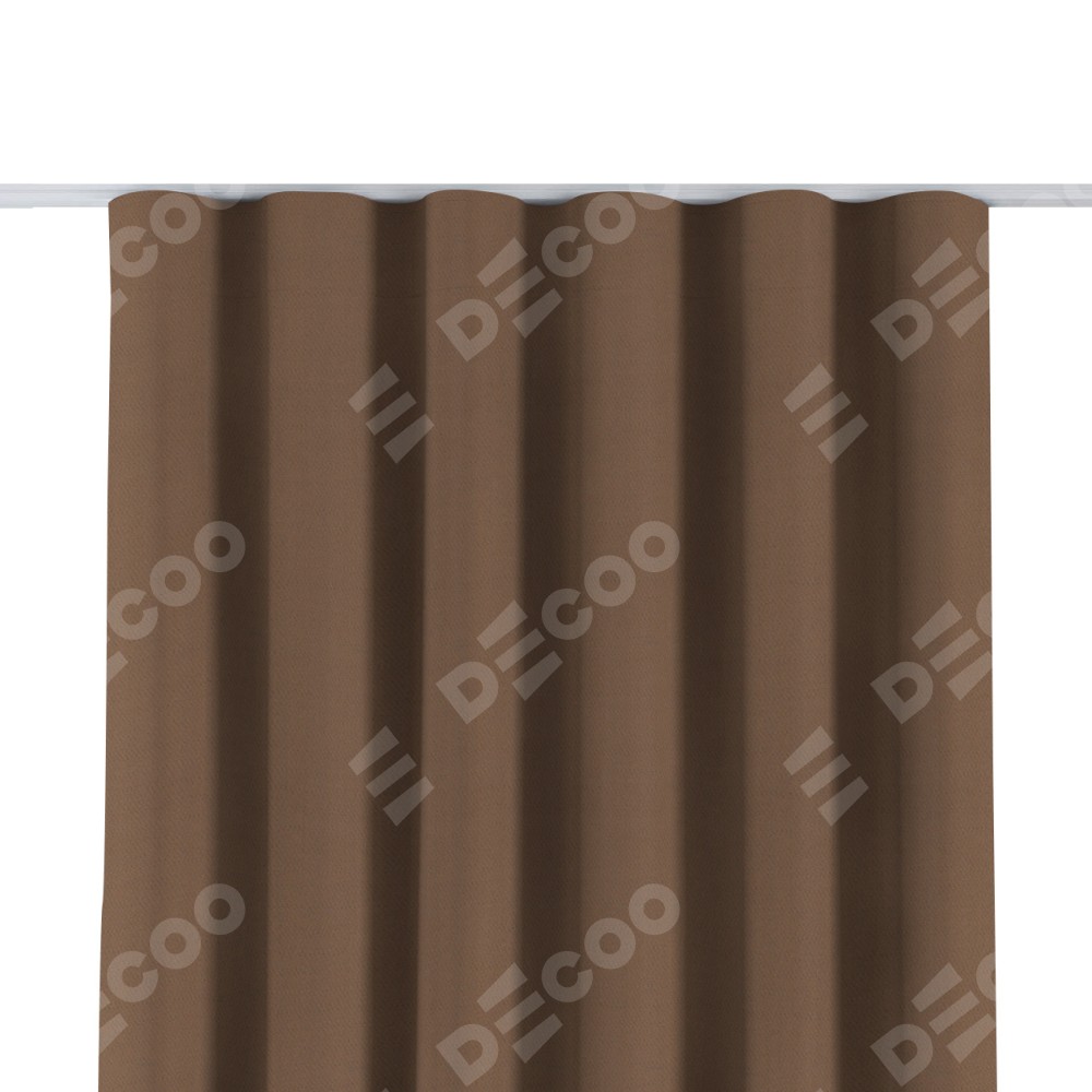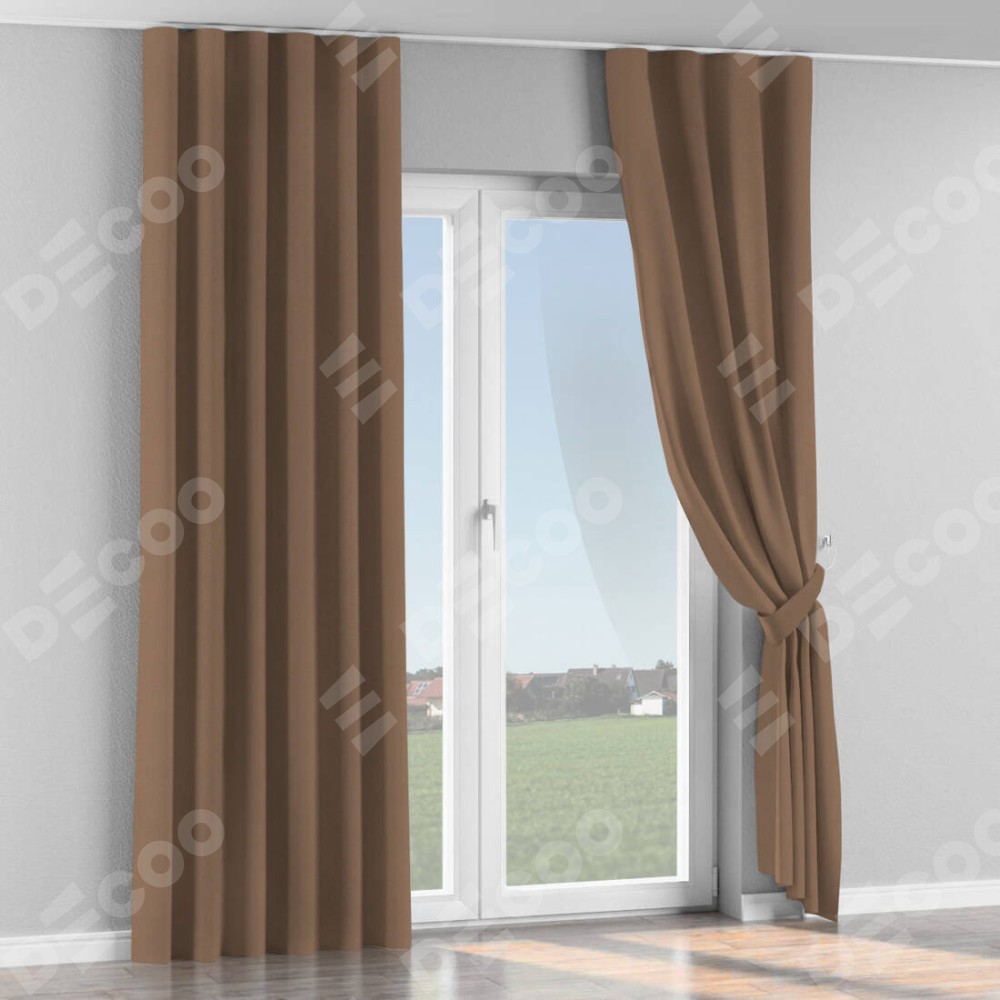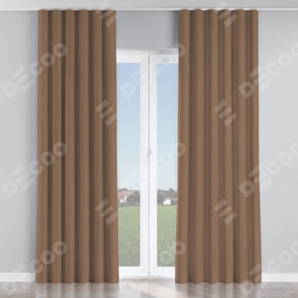 Комплект прямых штор, от производителя «Cortin», пошиты из ткани блэкаут однотонный коричневый, артикул ткани 88285. С изнаночной стороны в верхней части штор пристрачивается шторная лента с декоративными складками «Волна». Для создания элегантных складок прямые шторы шьются по стандарту с коэффициентом 1:2 (на 100 см. ширины проёма 200 см. ширины ткани).