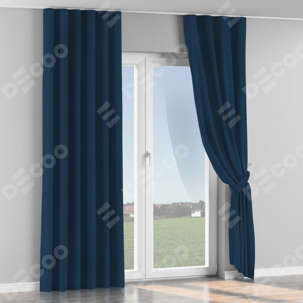 Комплект прямых штор, от производителя «Cortin», пошиты из ткани блэкаут однотонный синий, артикул ткани 29327. С изнаночной стороны в верхней части штор пристрачивается шторная лента с декоративными складками «Волна». Для создания элегантных складок прямые шторы шьются по стандарту с коэффициентом 1:2 (на 100 см. ширины проёма 200 см. ширины ткани).