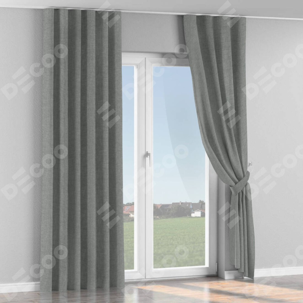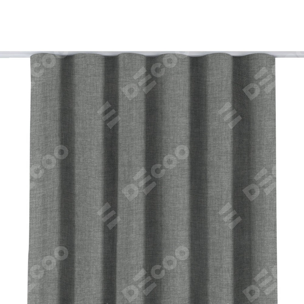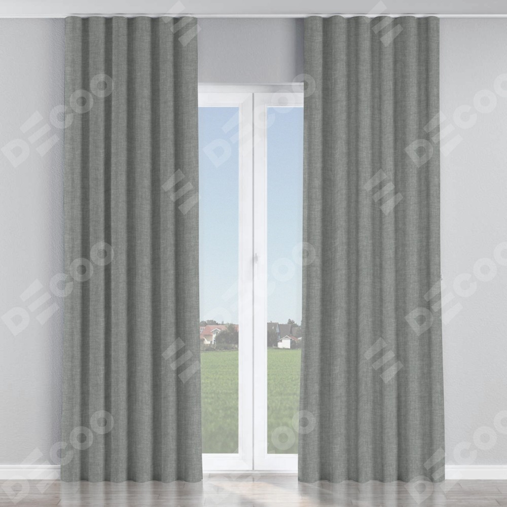 Комплект прямых штор, от производителя «Cortin», пошиты из ткани рогожка димаут тёмно-серый, артикул ткани 80418. С изнаночной стороны в верхней части штор пристрачивается шторная лента с декоративными складками «Волна». Для создания элегантных складок прямые шторы шьются по стандарту с коэффициентом 1:2 (на 100 см. ширины проёма 200 см. ширины ткани).