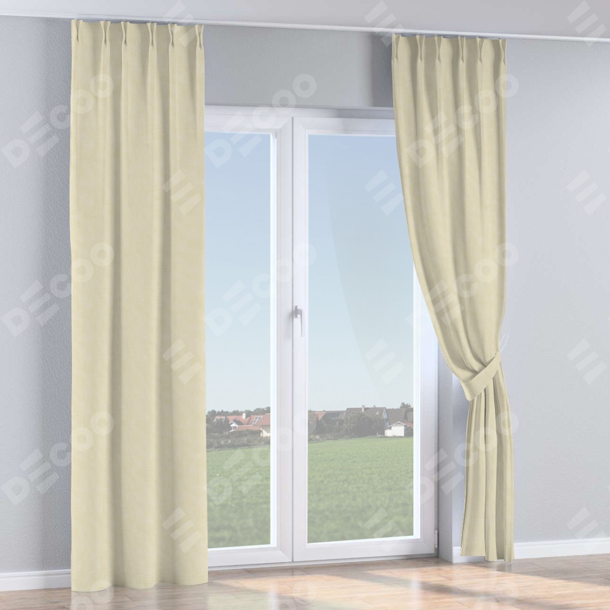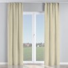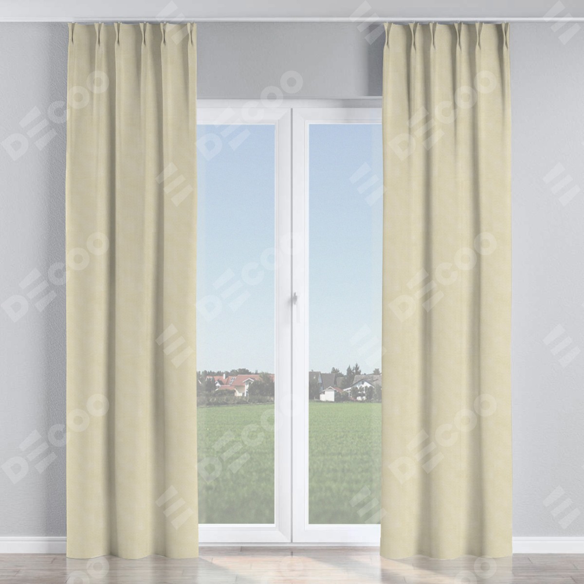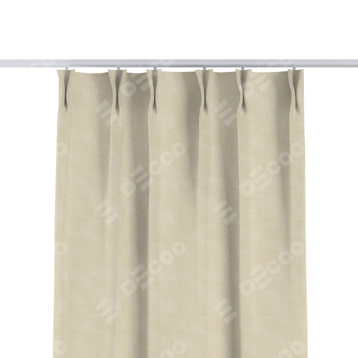 Комплект прямых штор, от производителя «Cortin», пошиты из ткани лён димаут бежевый, артикул ткани 83023. С изнаночной стороны в верхней части штор пристрачивается шторная лента с декоративными складками «Кустик». Для создания элегантных складок прямые шторы шьются по стандарту с коэффициентом 1:2 (на 100 см. ширины проёма 200 см. ширины ткани).