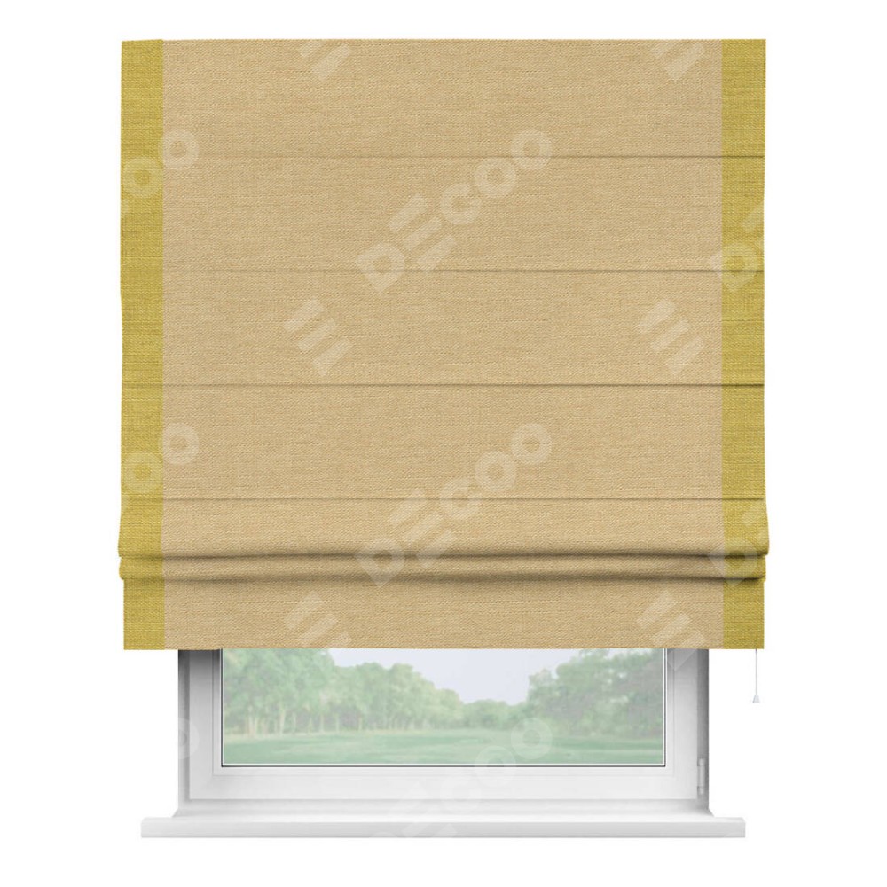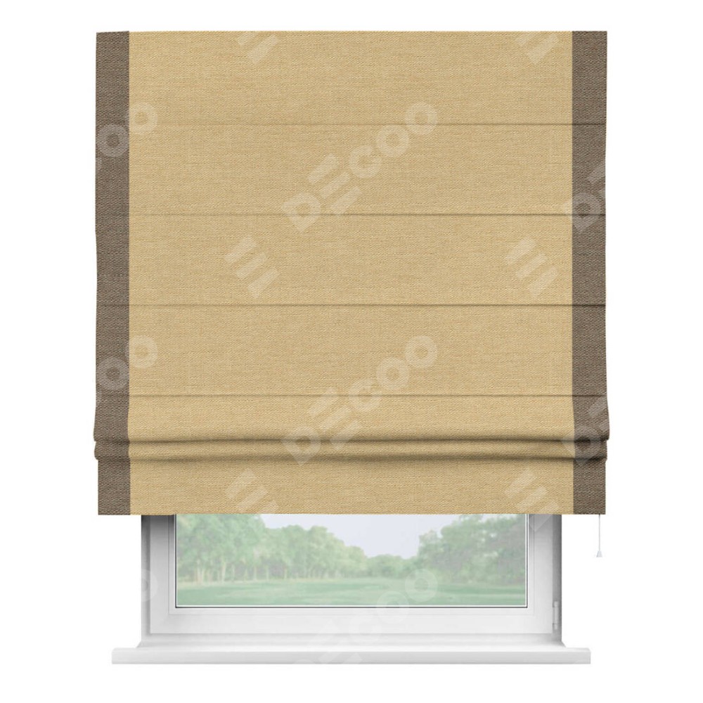 Римская штора производителя «Cortin», используется для проёма, пошита из ткани лён темно-бежевый, артикул 53433. Отделка шторы кантом «Стрим Дуо», ткань для канта используется из льна разной расцветки на выбор. Имеет универсальный механизм и подходит для монтажа: на потолок, на стену и в нишу.
