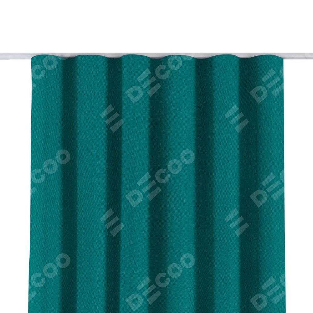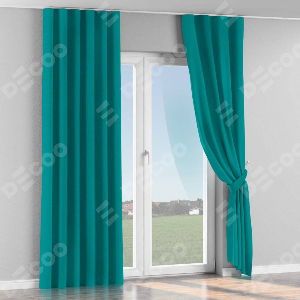 Комплект прямых штор, от производителя «Cortin», пошиты из ткани лён димаут тёмно-бирюзовый, артикул ткани 318. С изнаночной стороны в верхней части штор пристрачивается шторная лента с декоративными складками «Волна». Для создания элегантных складок прямые шторы шьются по стандарту с коэффициентом 1:2 (на 100 см. ширины проёма 200 см. ширины ткани).