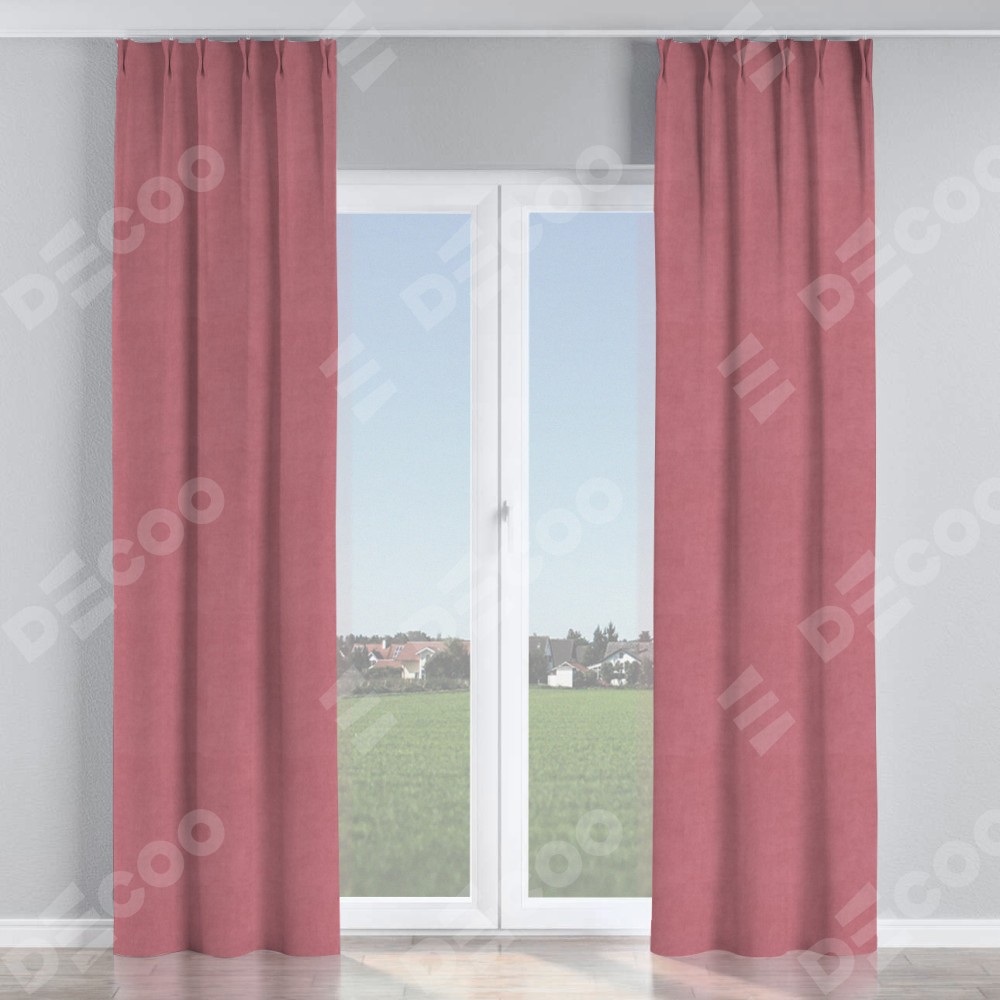 Комплект прямых штор, от производителя «Cortin», пошиты из ткани вельвет брусника, артикул ткани 85550. С изнаночной стороны в верхней части штор пристрачивается шторная лента с декоративными складками «Кустик». Для создания элегантных складок прямые шторы шьются по стандарту с коэффициентом 1:2 (на 100 см. ширины проёма 200 см. ширины ткани).