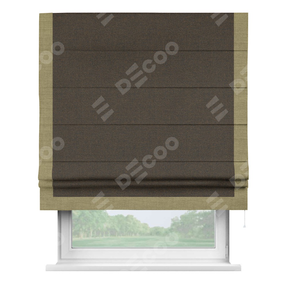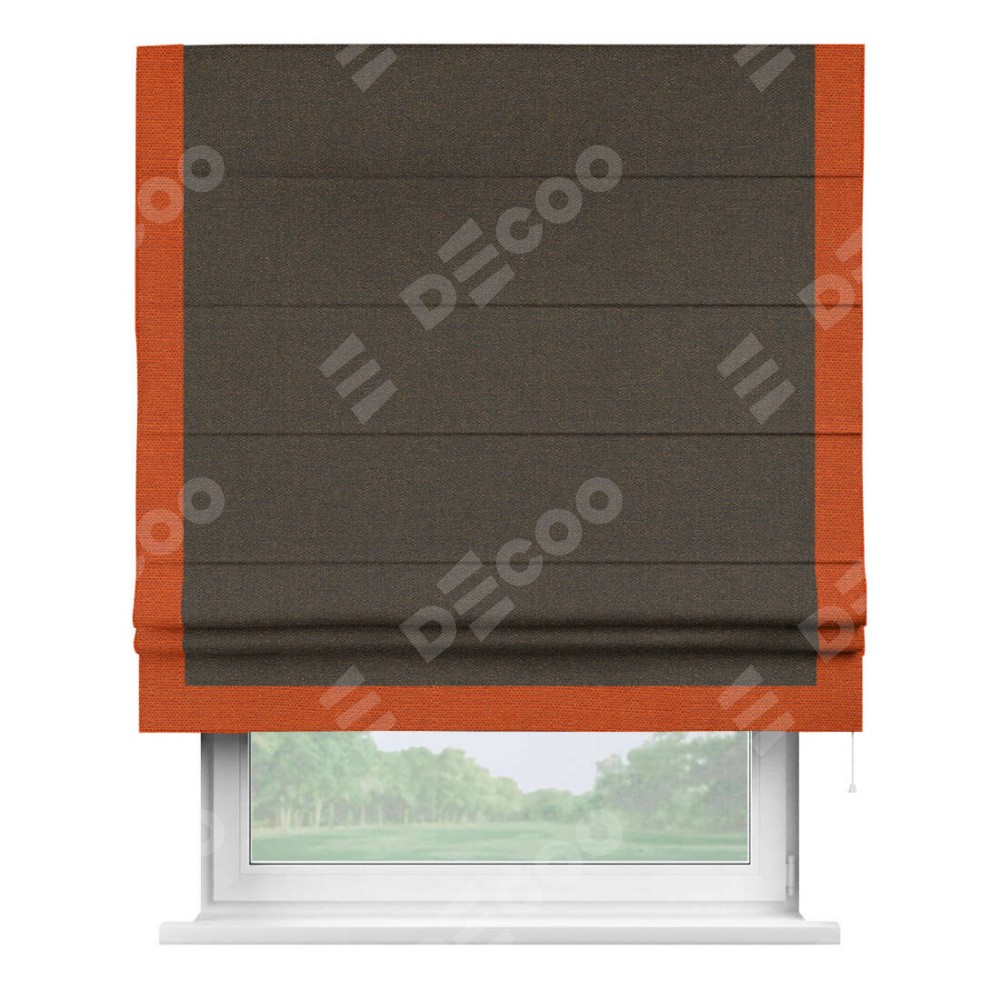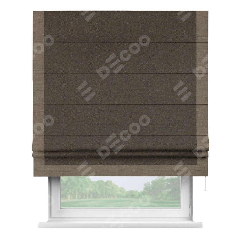 Римская штора производителя «Cortin», используется для проёма, пошита из ткани лён темно-коричневый, артикул 53444. Отделка шторы кантом «Виктория», ткань для канта используется из льна разной расцветки на выбор. Имеет универсальный механизм и подходит для монтажа: на потолок, на стену и в нишу.