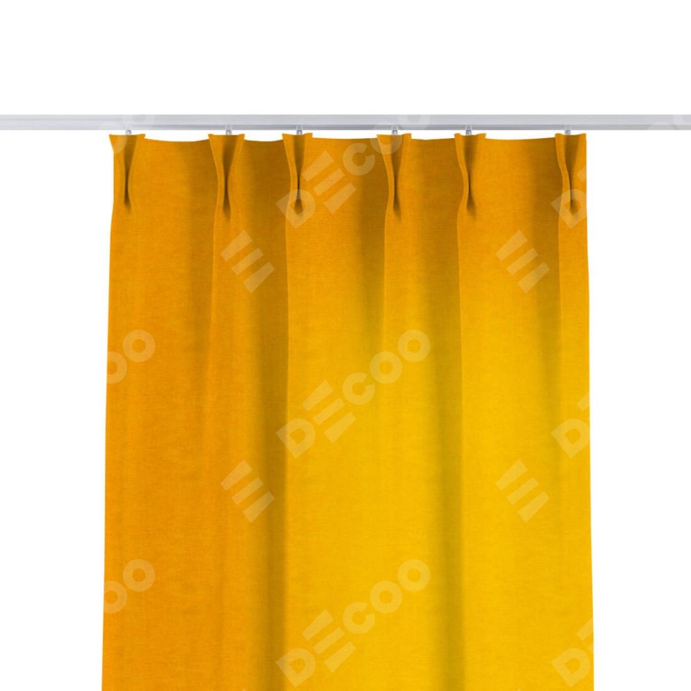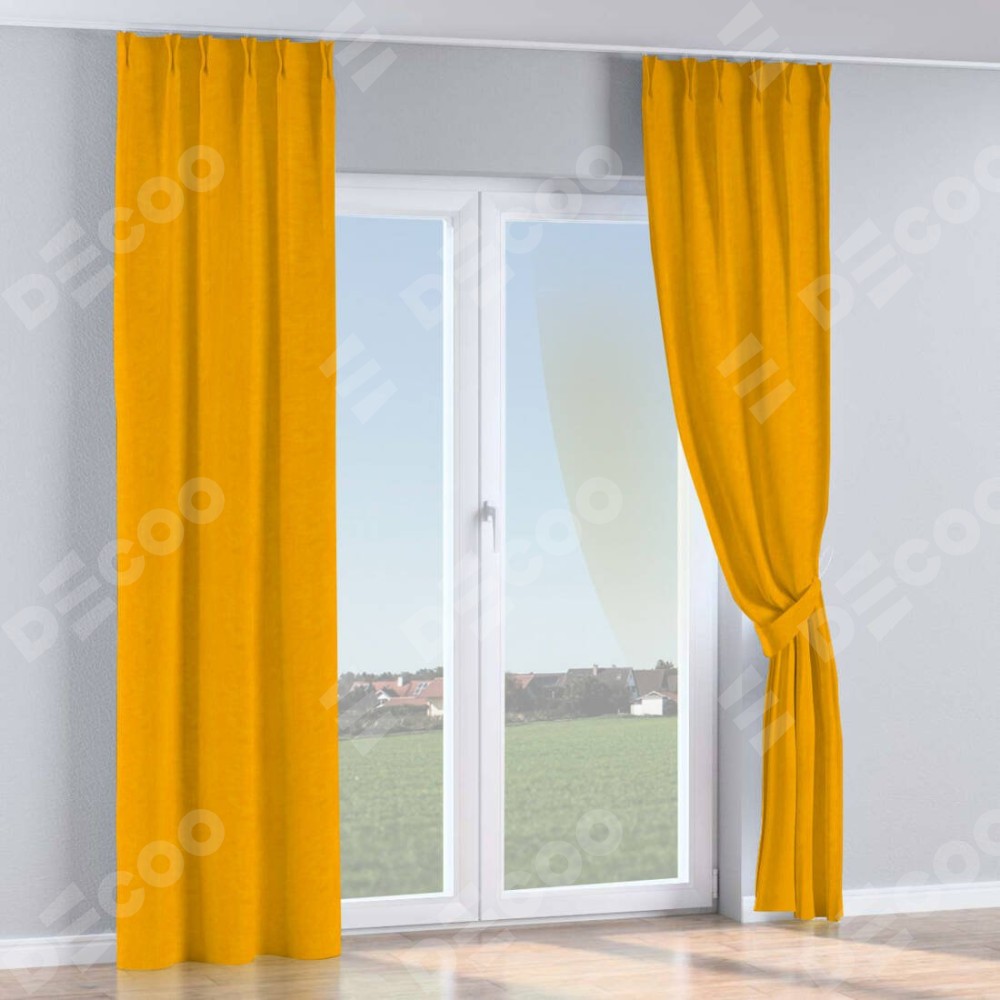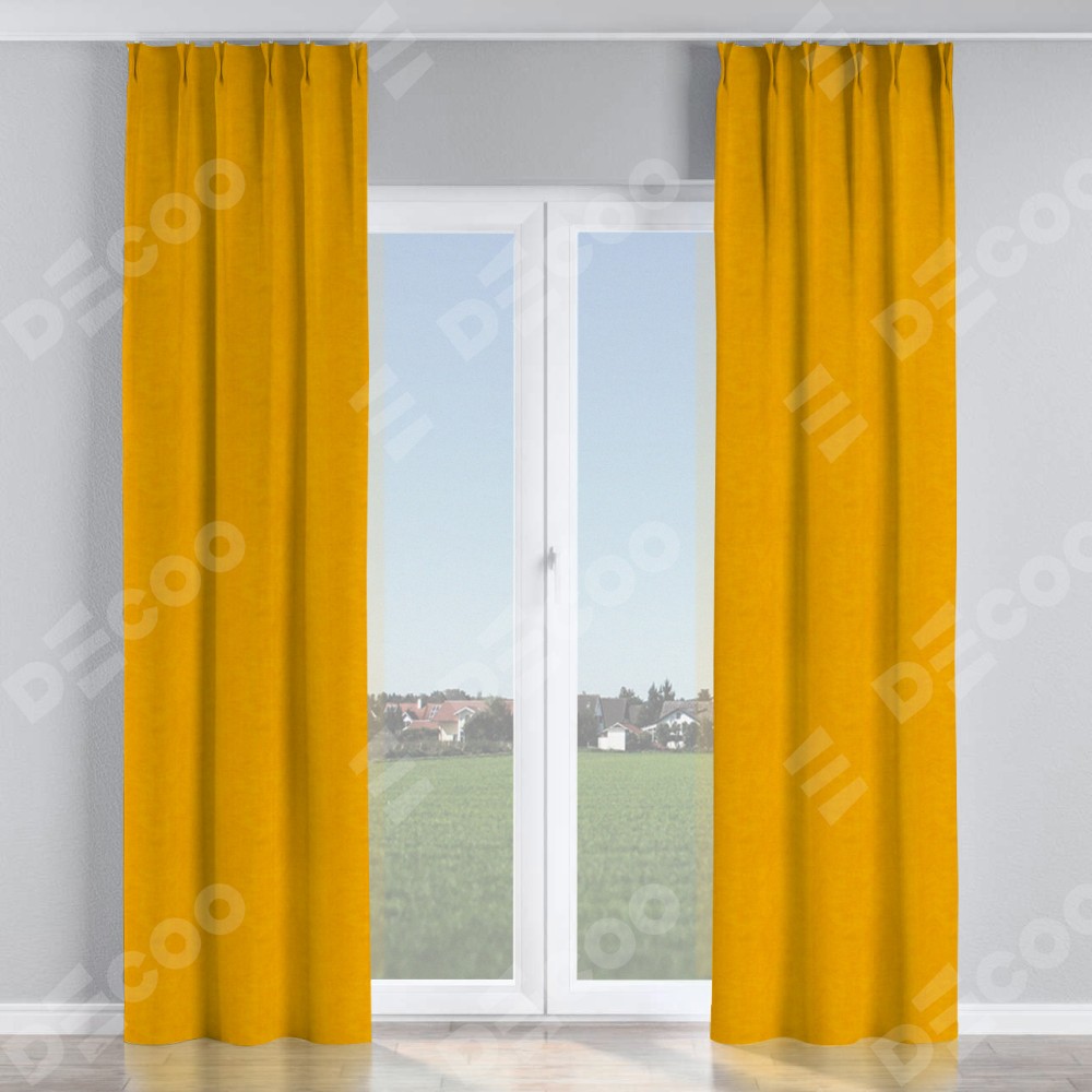Комплект прямых штор, от производителя «Cortin», пошиты из ткани вельвет желтый, артикул ткани 85547. С изнаночной стороны в верхней части штор пристрачивается шторная лента с декоративными складками «Кустик». Для создания элегантных складок прямые шторы шьются по стандарту с коэффициентом 1:2 (на 100 см. ширины проёма 200 см. ширины ткани).