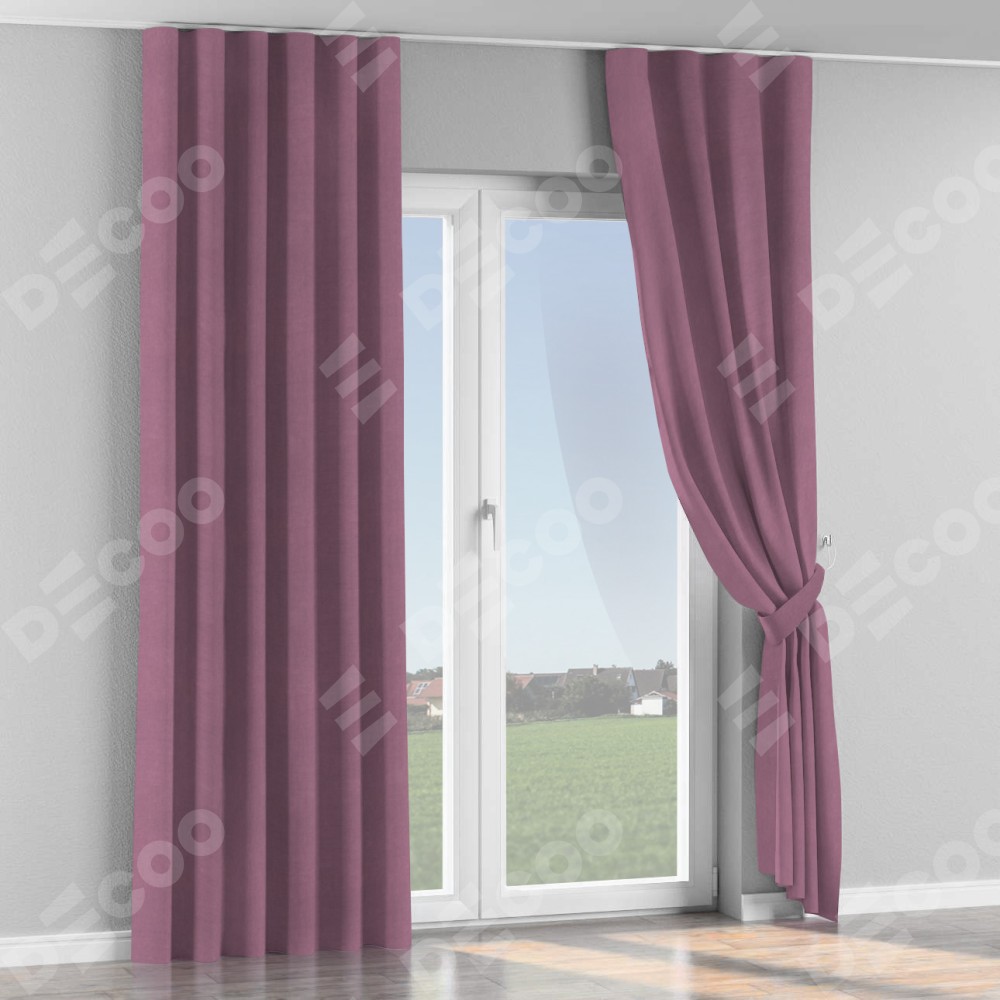 Комплект прямых штор, от производителя «Cortin», пошиты из ткани вельвет лиловый, артикул ткани 17752. С изнаночной стороны в верхней части штор пристрачивается шторная лента с декоративными складками «Волна». Для создания элегантных складок прямые шторы шьются по стандарту с коэффициентом 1:2 (на 100 см. ширины проёма 200 см. ширины ткани).