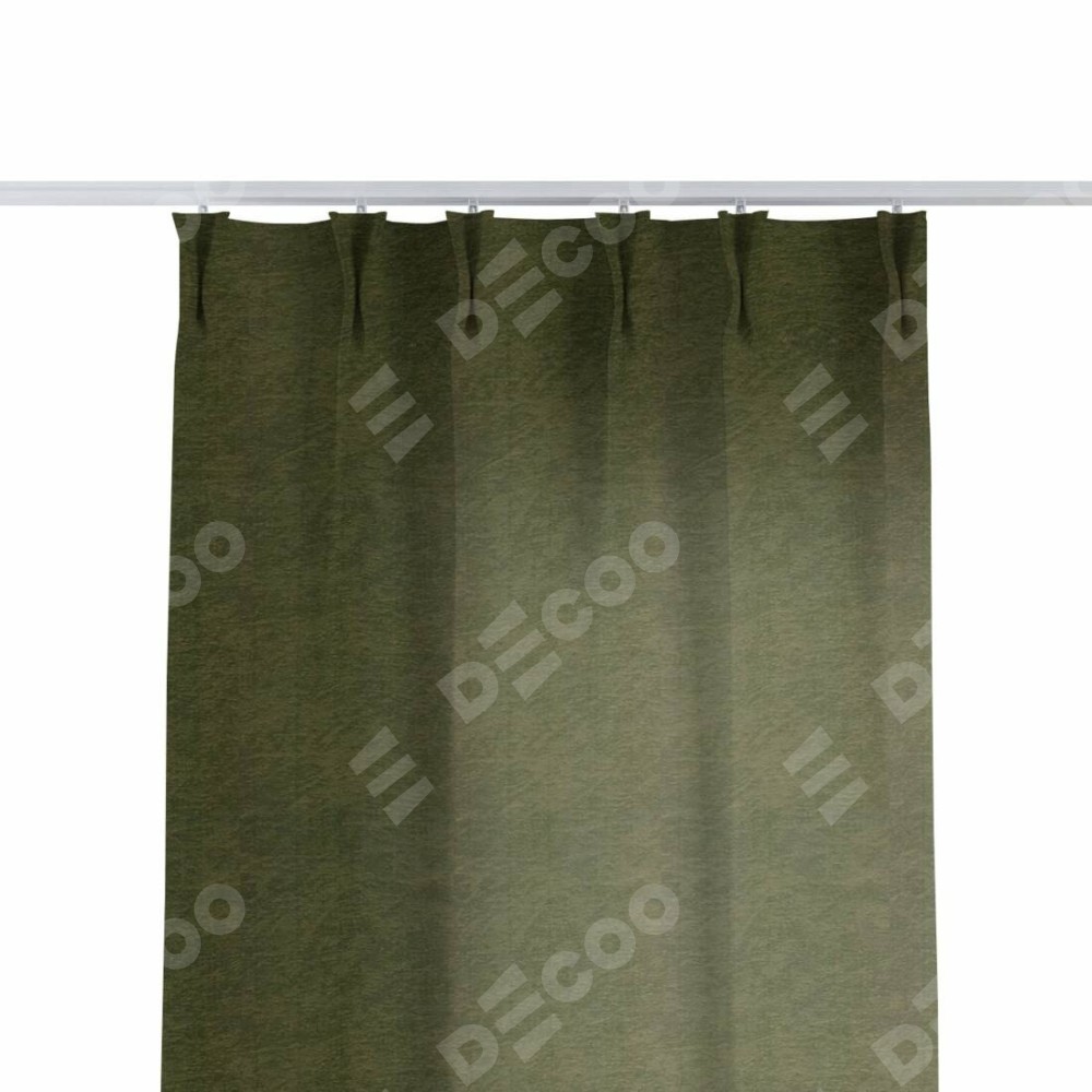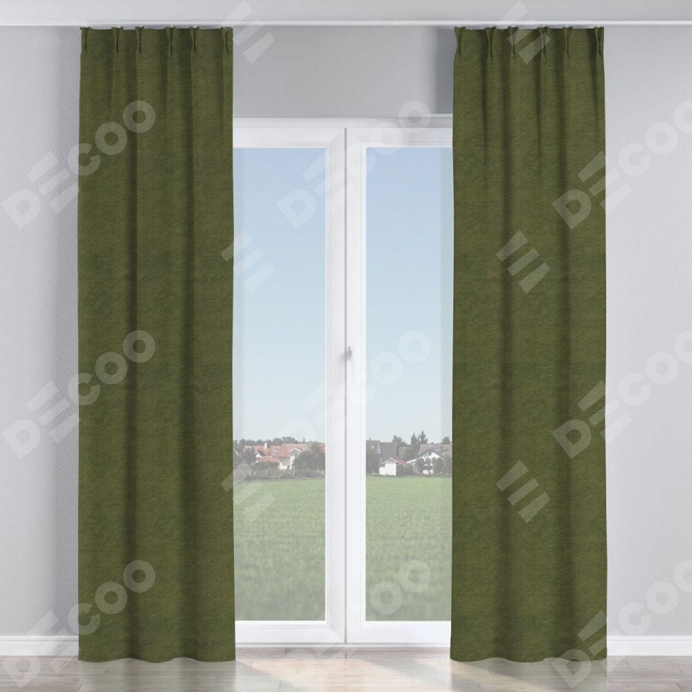 Комплект прямых штор, от производителя «Cortin», пошиты из ткани софт однотонный зелёный, артикул ткани 33110. С изнаночной стороны в верхней части штор пристрачивается шторная лента с декоративными складками «Кустик». Для создания элегантных складок прямые шторы шьются по стандарту с коэффициентом 1:2 (на 100 см. ширины проёма 200 см. ширины ткани).