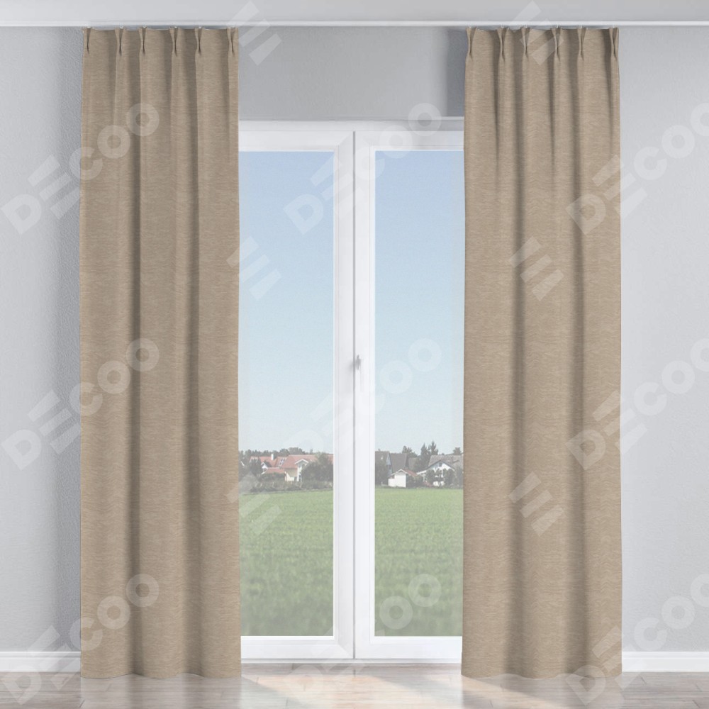 Комплект прямых штор, от производителя «Cortin», пошиты из ткани софт однотонный тёмно-бежевый, артикул ткани 1640. С изнаночной стороны в верхней части штор пристрачивается шторная лента с декоративными складками «Кустик». Для создания элегантных складок прямые шторы шьются по стандарту с коэффициентом 1:2 (на 100 см. ширины проёма 200 см. ширины ткани).