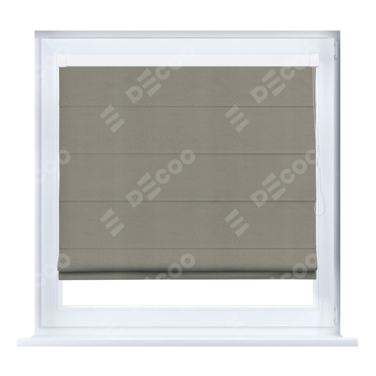 Римская штора кассетного типа, производителя «Cortin», устанавливается только на пластиковые окна и прилегает к стеклопакету, пошита из ткани блэкаут однотонный бежево-серый, артикул 00004.
