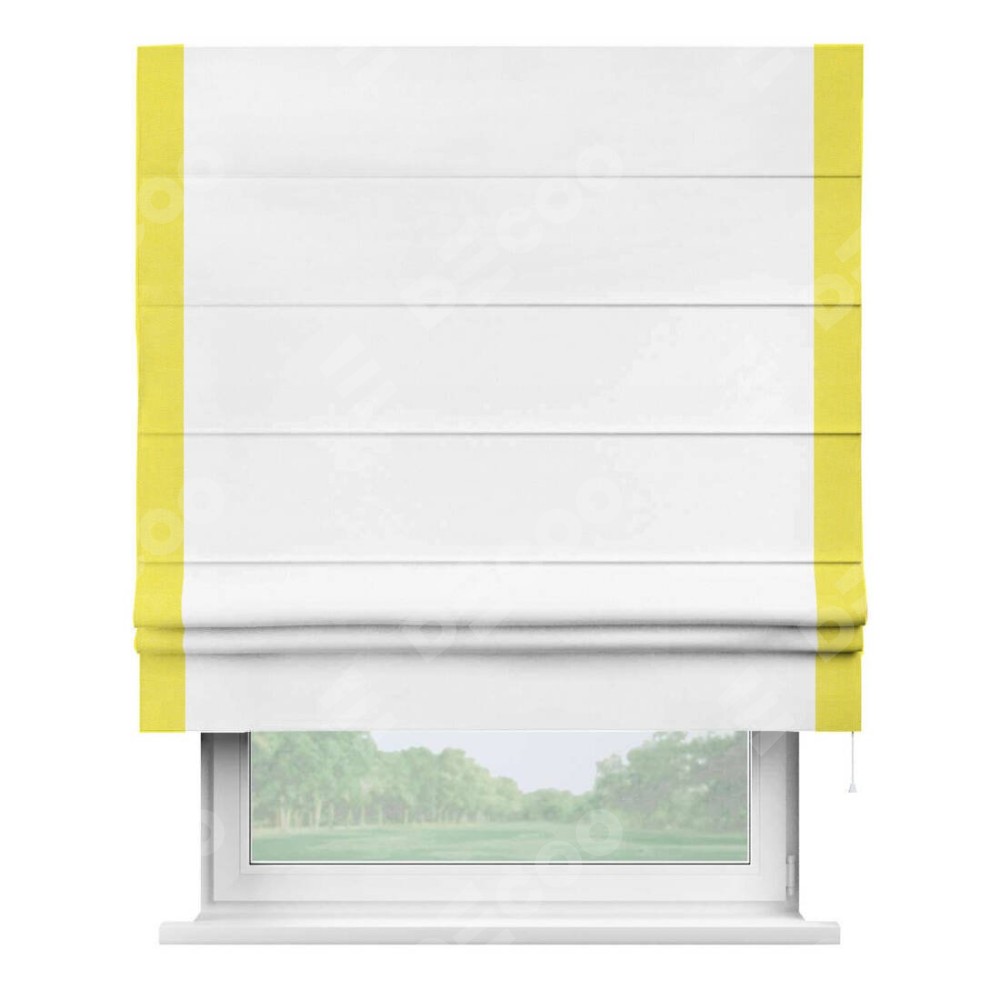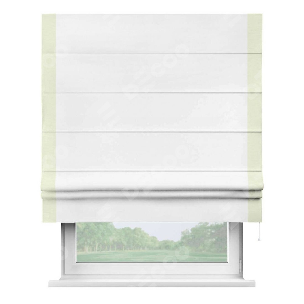 Римская штора производителя «Cortin», используется для проёма, пошита из ткани вельвет белый, артикул ткани 10810. Отделка шторы кантом «Стрим Дуо», ткань для канта используется из вельвета разной расцветки на выбор. Имеет универсальный механизм и подходит для монтажа: на потолок, на стену и в нишу.