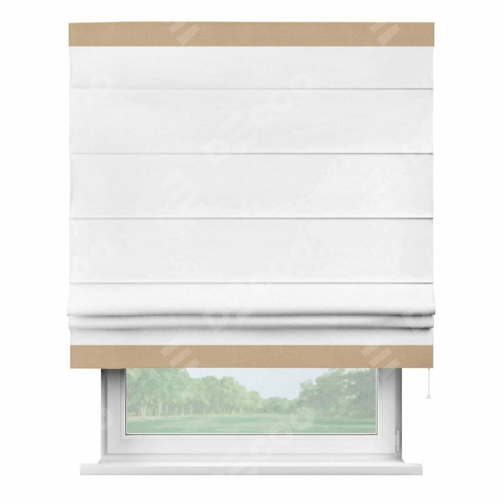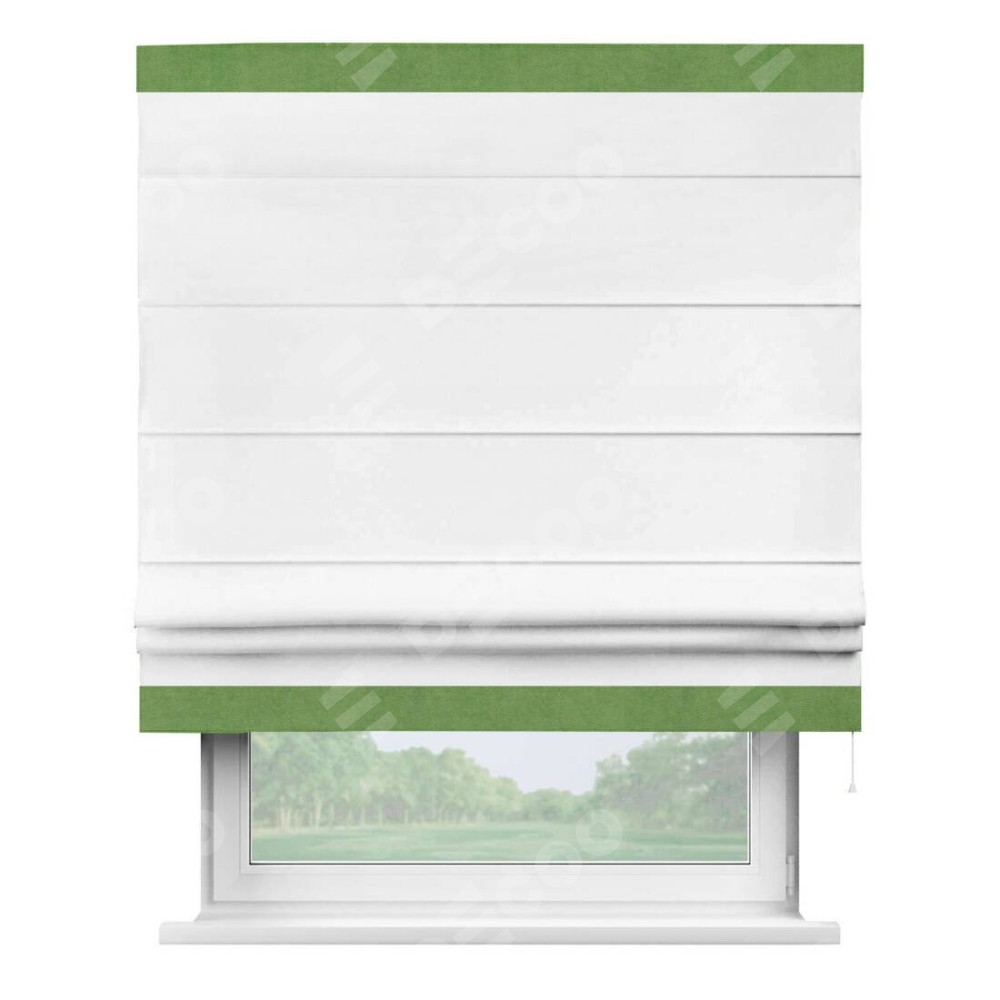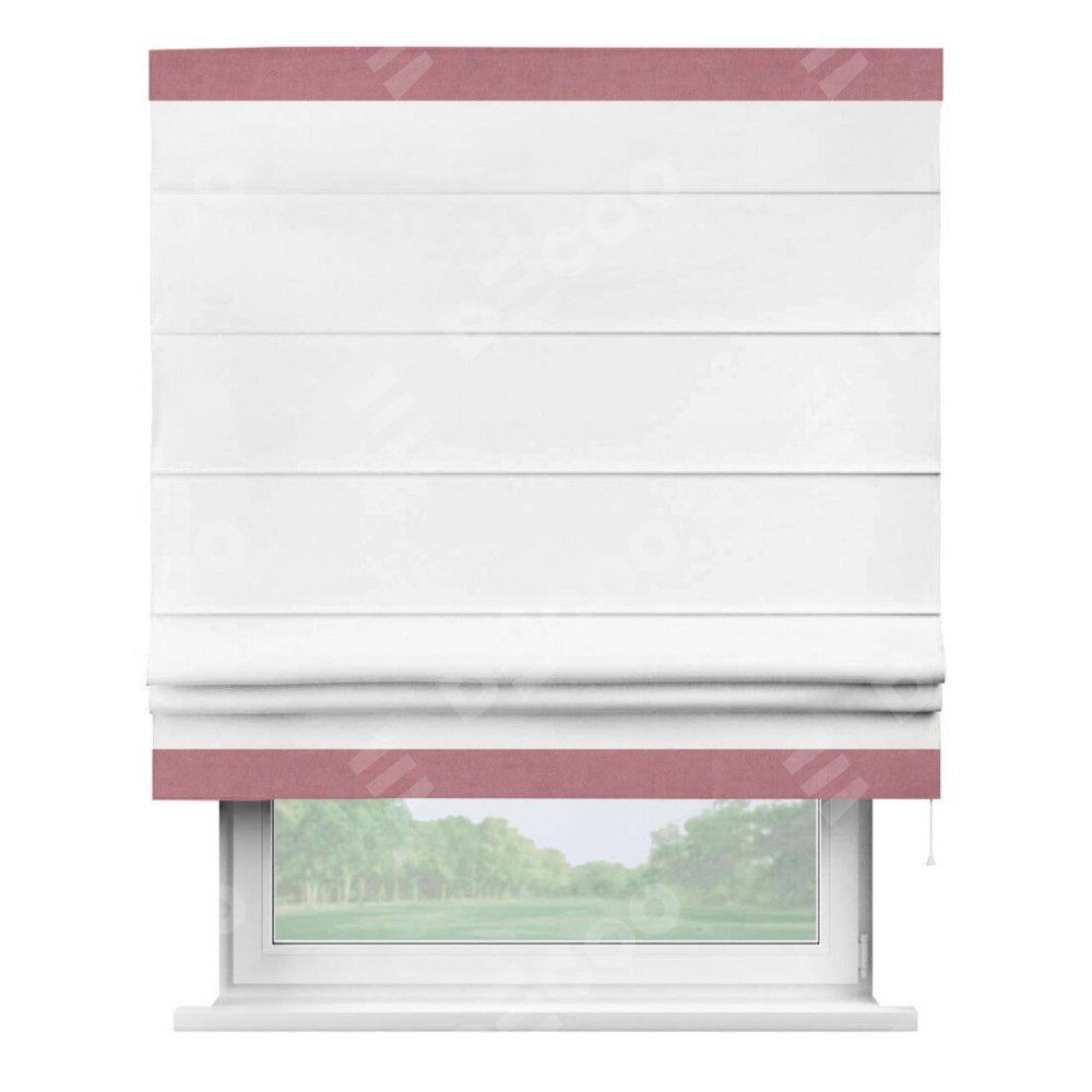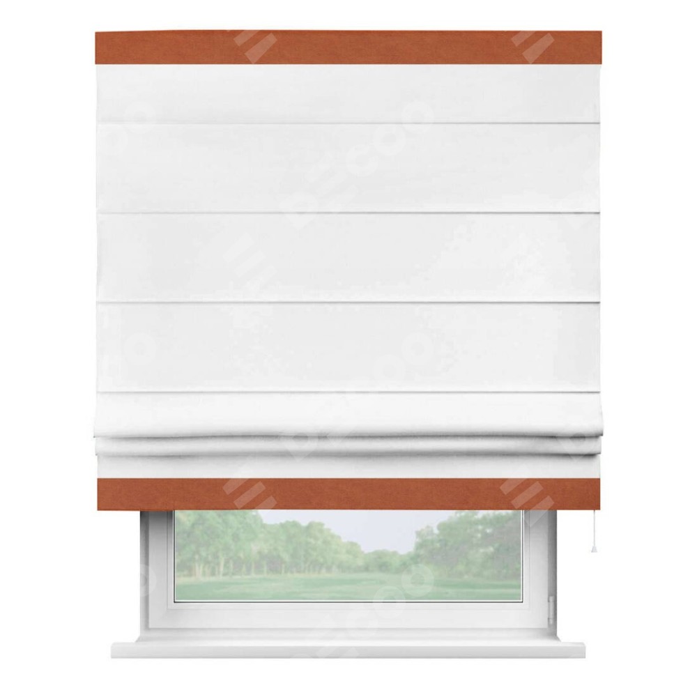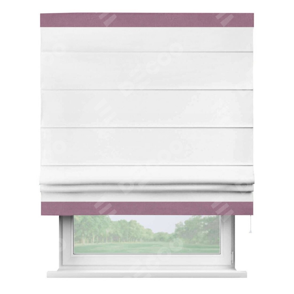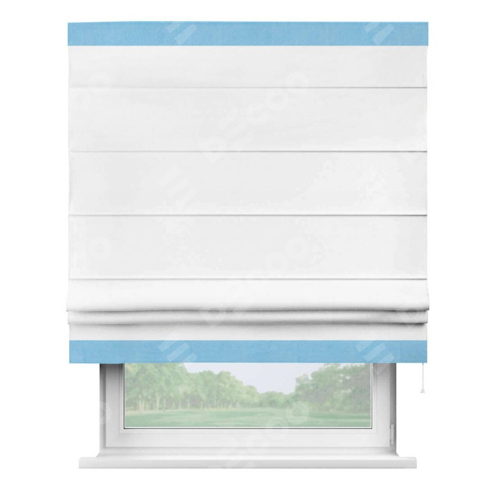 Римская штора производителя «Cortin», используется для проёма, пошита из ткани вельвет белый, артикул ткани 10810. Отделка шторы кантом «Горизонт», ткань для канта используется из вельвета разной расцветки на выбор. Имеет универсальный механизм и подходит для монтажа: на потолок, на стену и в нишу.