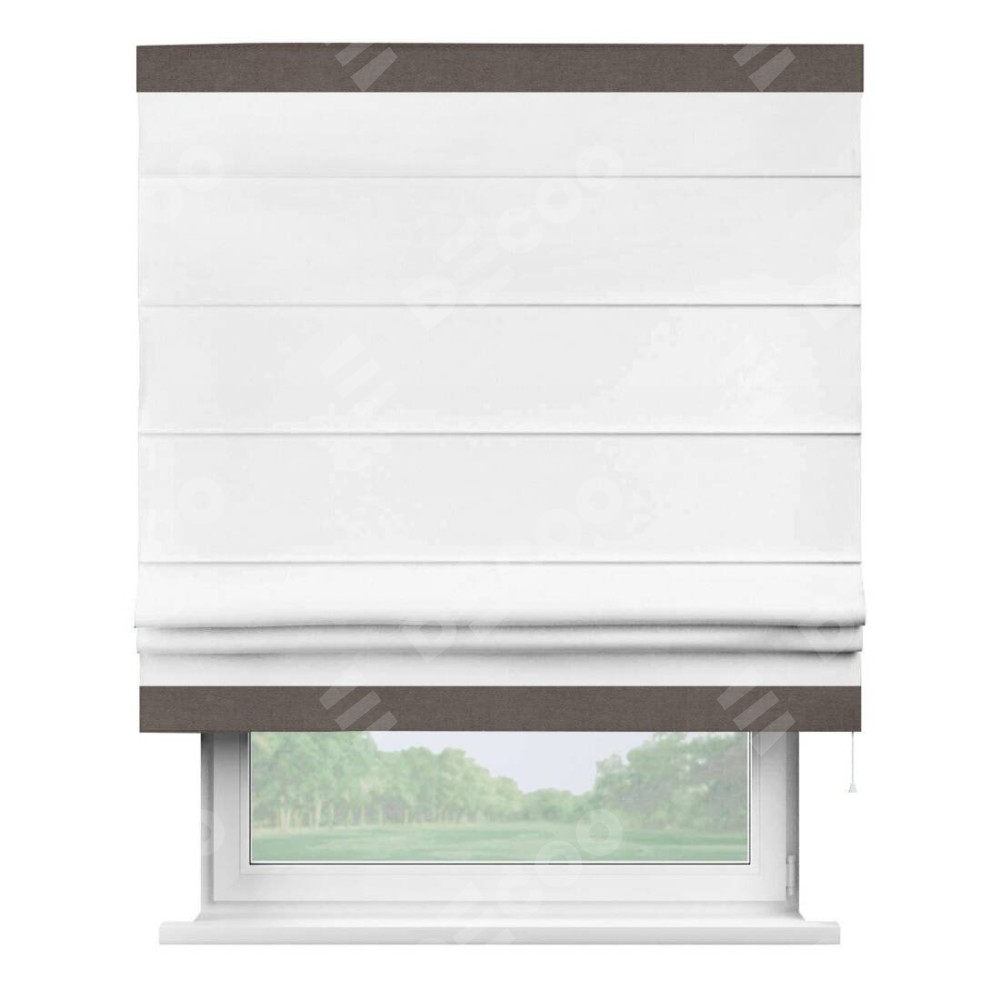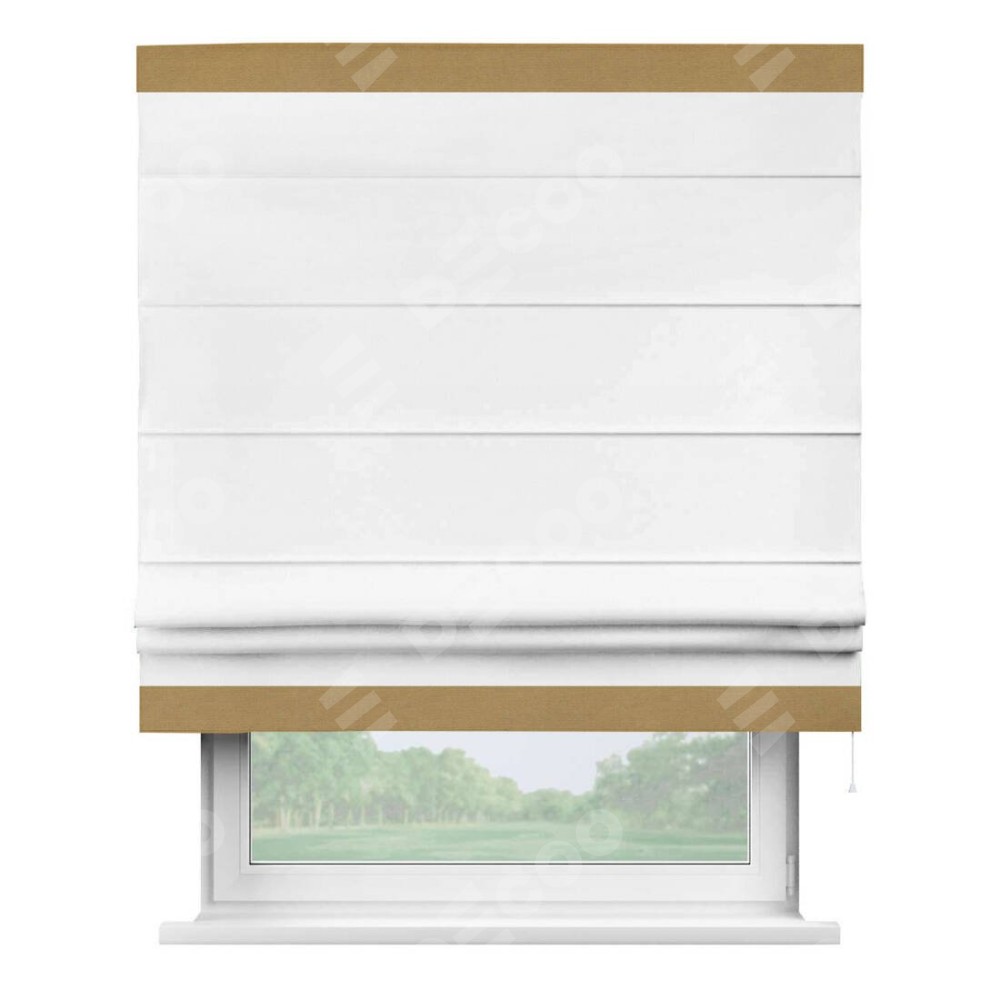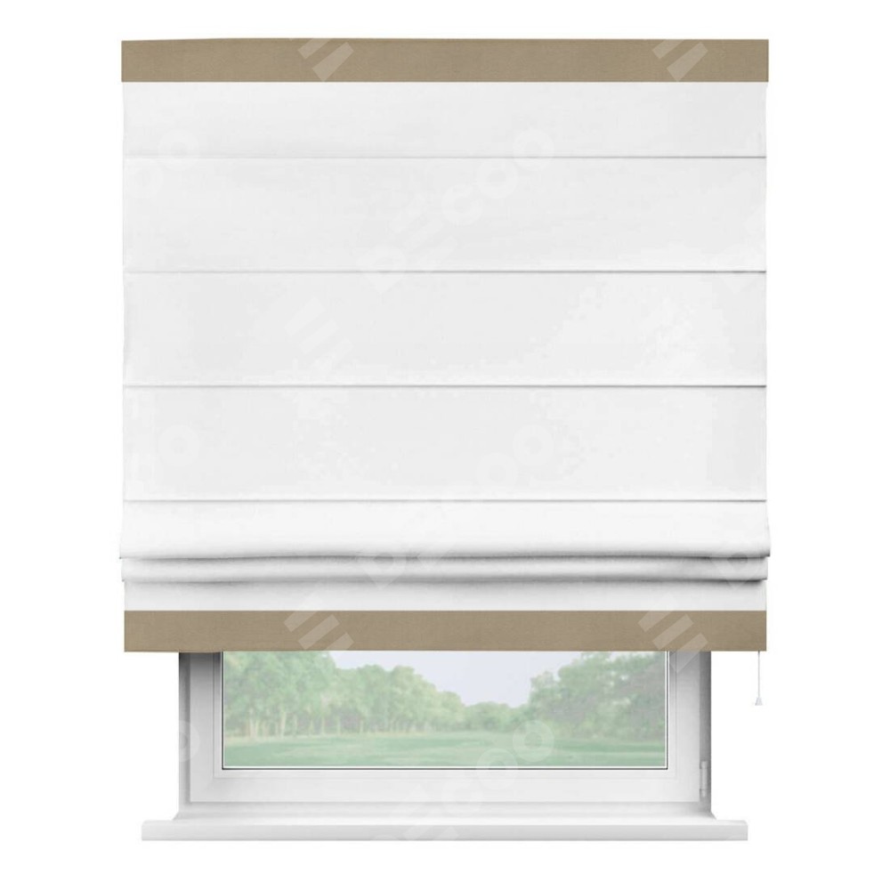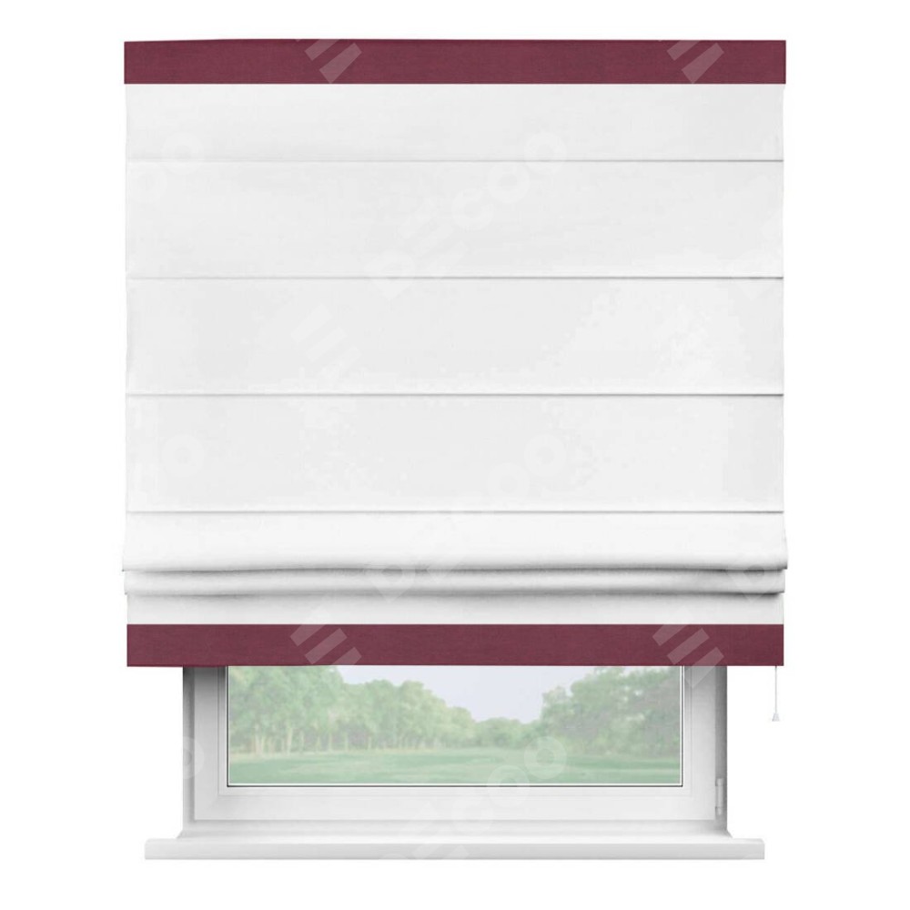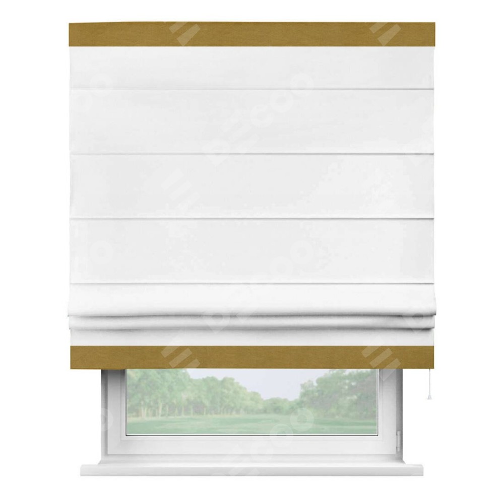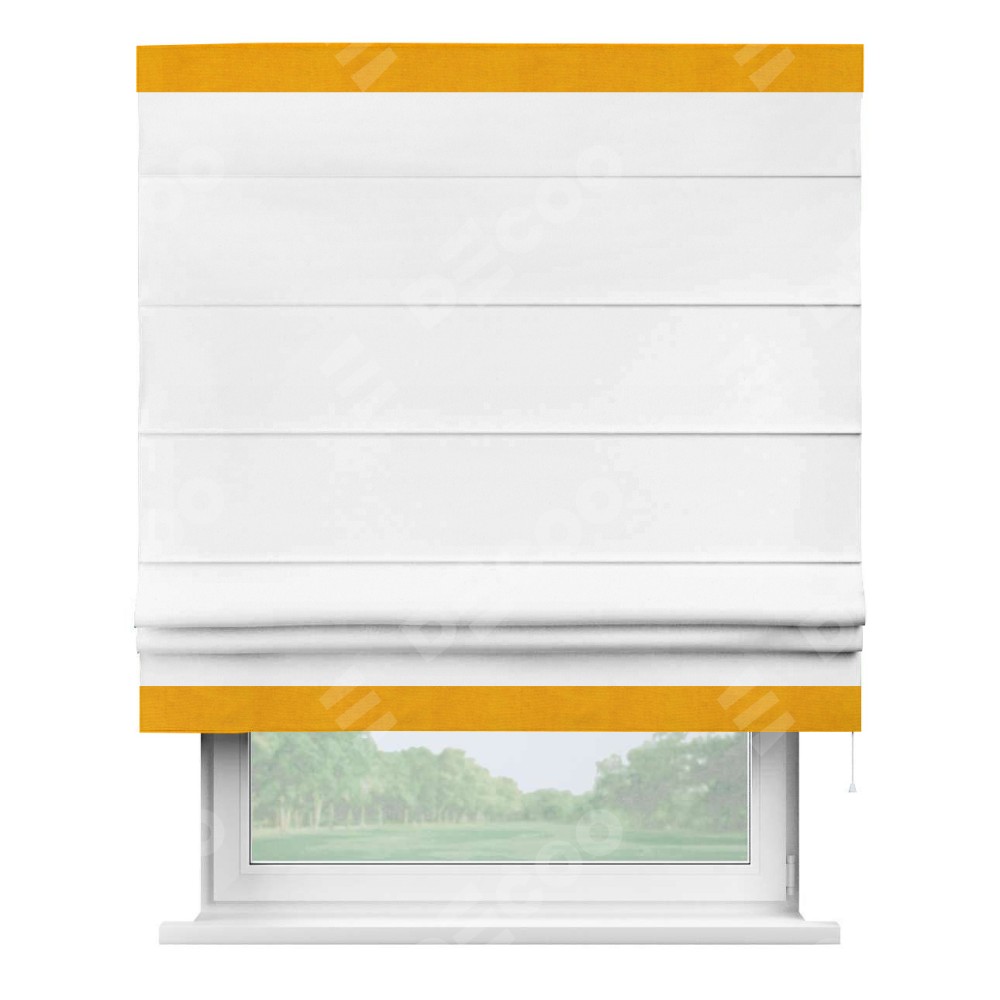 Римская штора производителя «Cortin», используется для проёма, пошита из ткани вельвет белый, артикул ткани 10810. Отделка шторы кантом «Горизонт», ткань для канта используется из вельвета разной расцветки на выбор. Имеет универсальный механизм и подходит для монтажа: на потолок, на стену и в нишу.