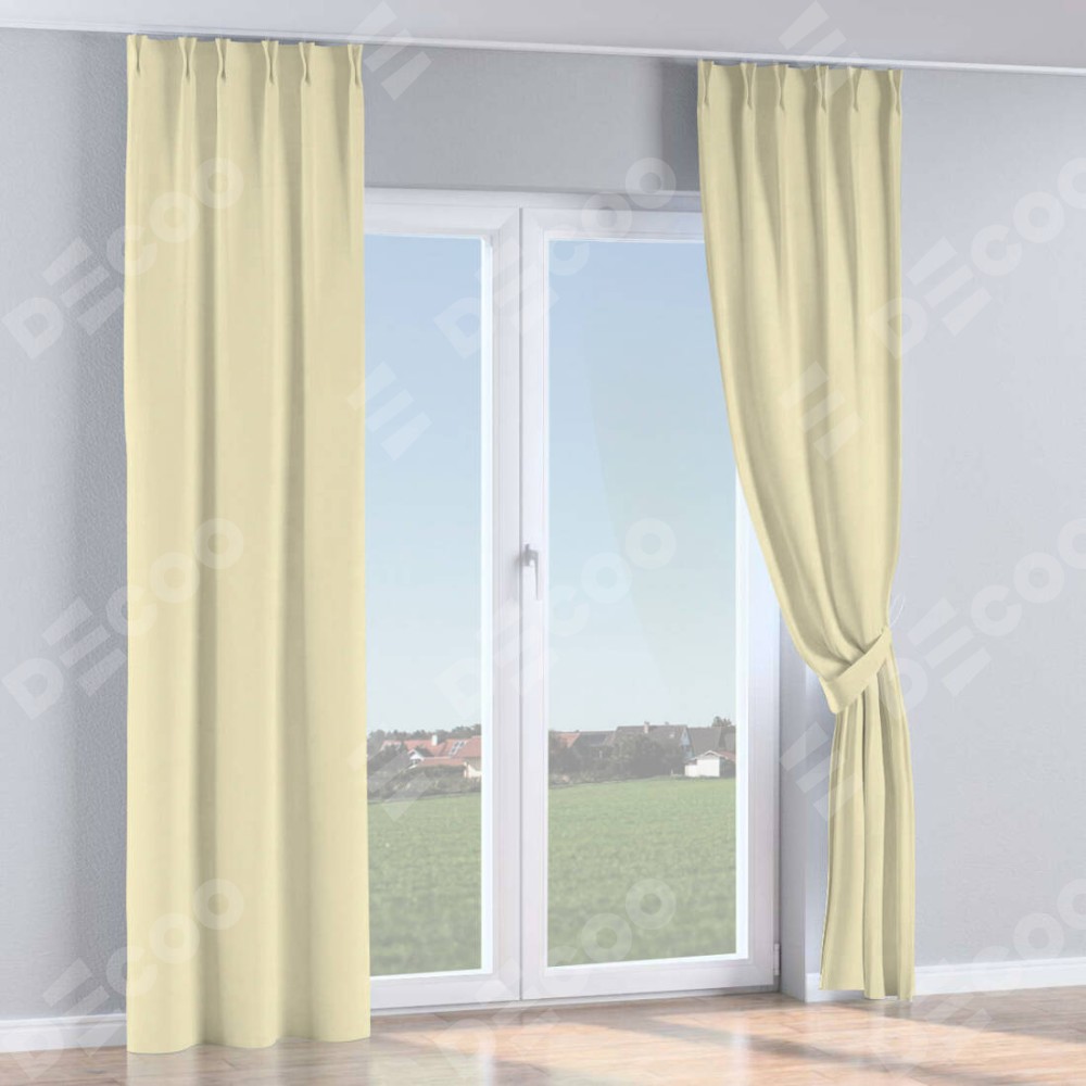 Комплект прямых штор, от производителя «Cortin», пошиты из ткани блэкаут однотонный бежевый, артикул ткани 88283. С изнаночной стороны в верхней части штор пристрачивается шторная лента с декоративными складками «Кустик». Для создания элегантных складок прямые шторы шьются по стандарту с коэффициентом 1:2 (на 100 см. ширины проёма 200 см. ширины ткани).