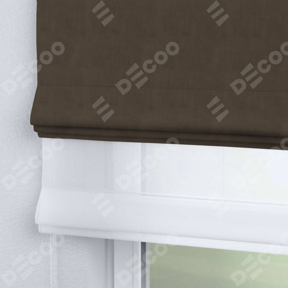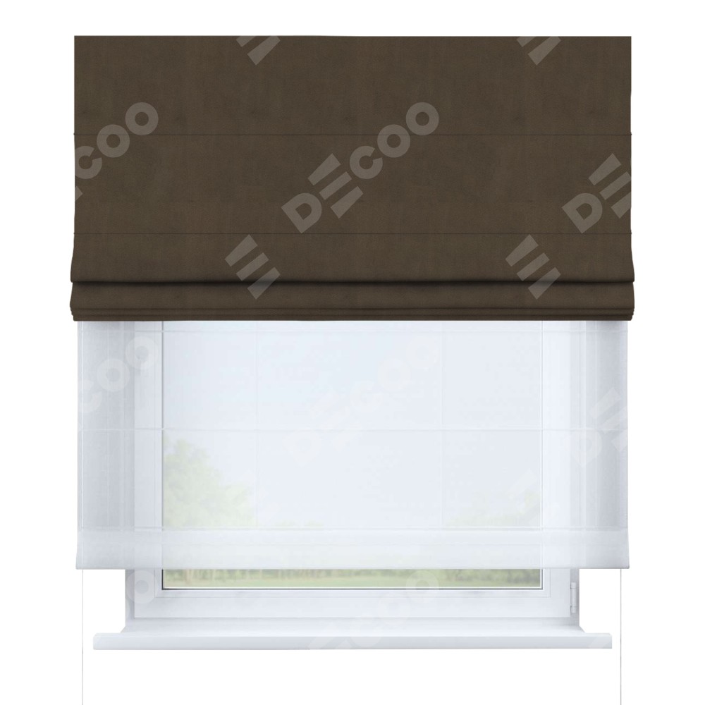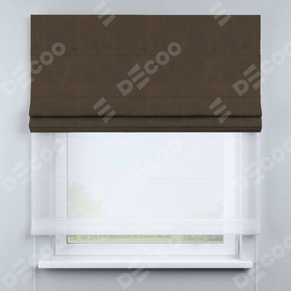 Римская штора день-ночь производителя «Cortin», используется для проёма, пошита из двух полотен, с лицевой стороны бархат тёмно-коричневый артикул 5017, вторая ткань тюль (по стандарту комплектуется тюль белого цвета артикул V-01). Имеет универсальный механизм и подходит для монтажа: на потолок, на стену и в нишу.