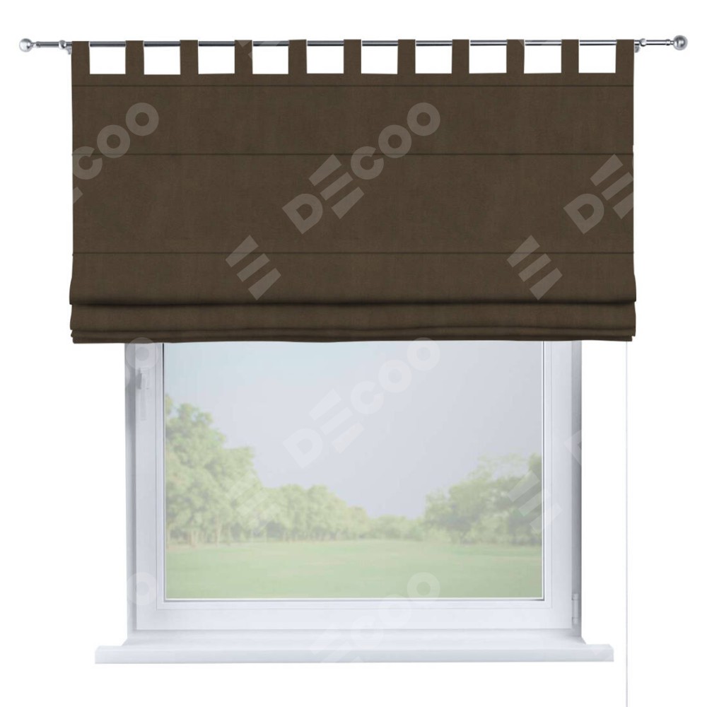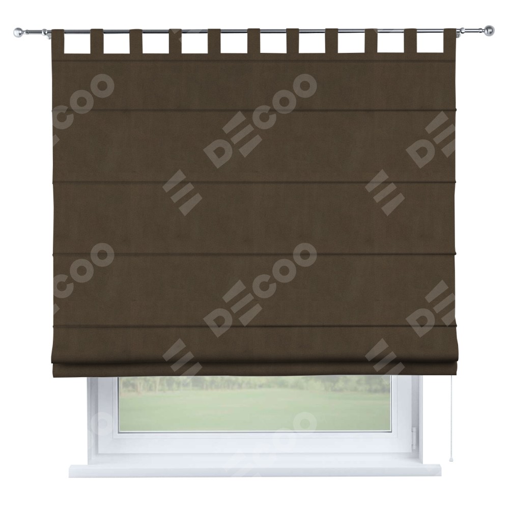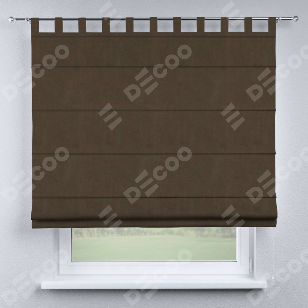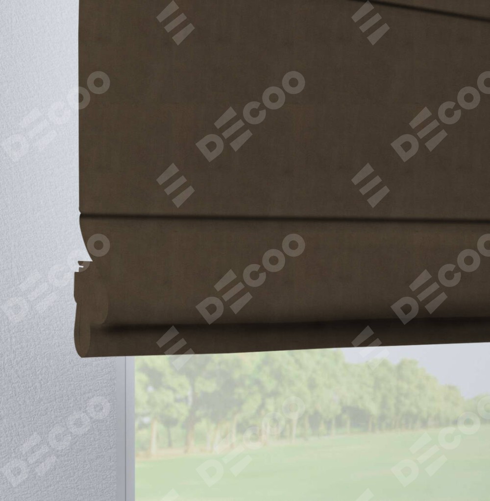 Римская штора производителя «Cortin», используется для проёма, пошита из ткани бархат тёмно-коричневый, артикул ткани 5017. Данная модель пошита на петлях, комплектуется на выбор круглым карнизом и подходит для монтажа на стену. Римская штора на петлях имеет простую систему регулировки высоты, отличительным преимуществом данной модели является простой способ монтажа. Достаточно повесить ее на трубу и штора готова!