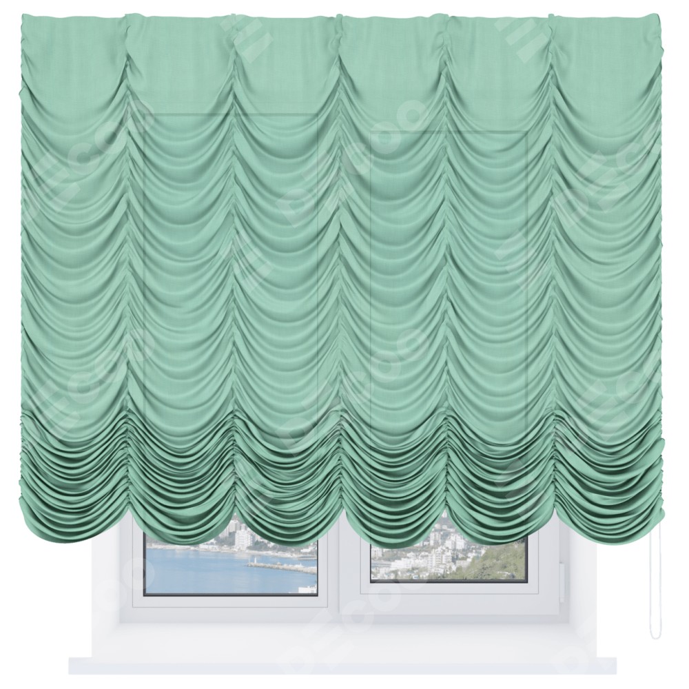 Французская штора производителя «Cortin», используется для проёма, пошита из ткани лён светло-бирюзовый, артикул ткани 74737. Имеет универсальный механизм и подходит для монтажа: на потолок и на стену.