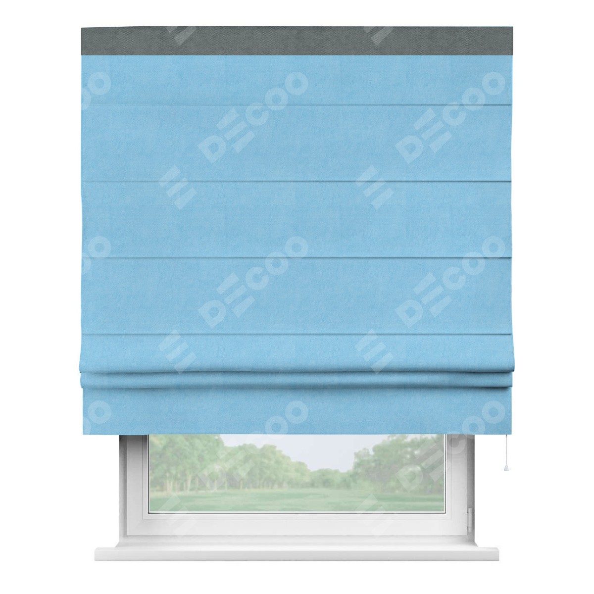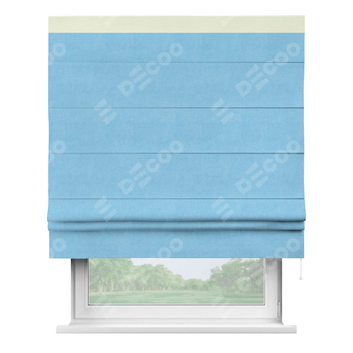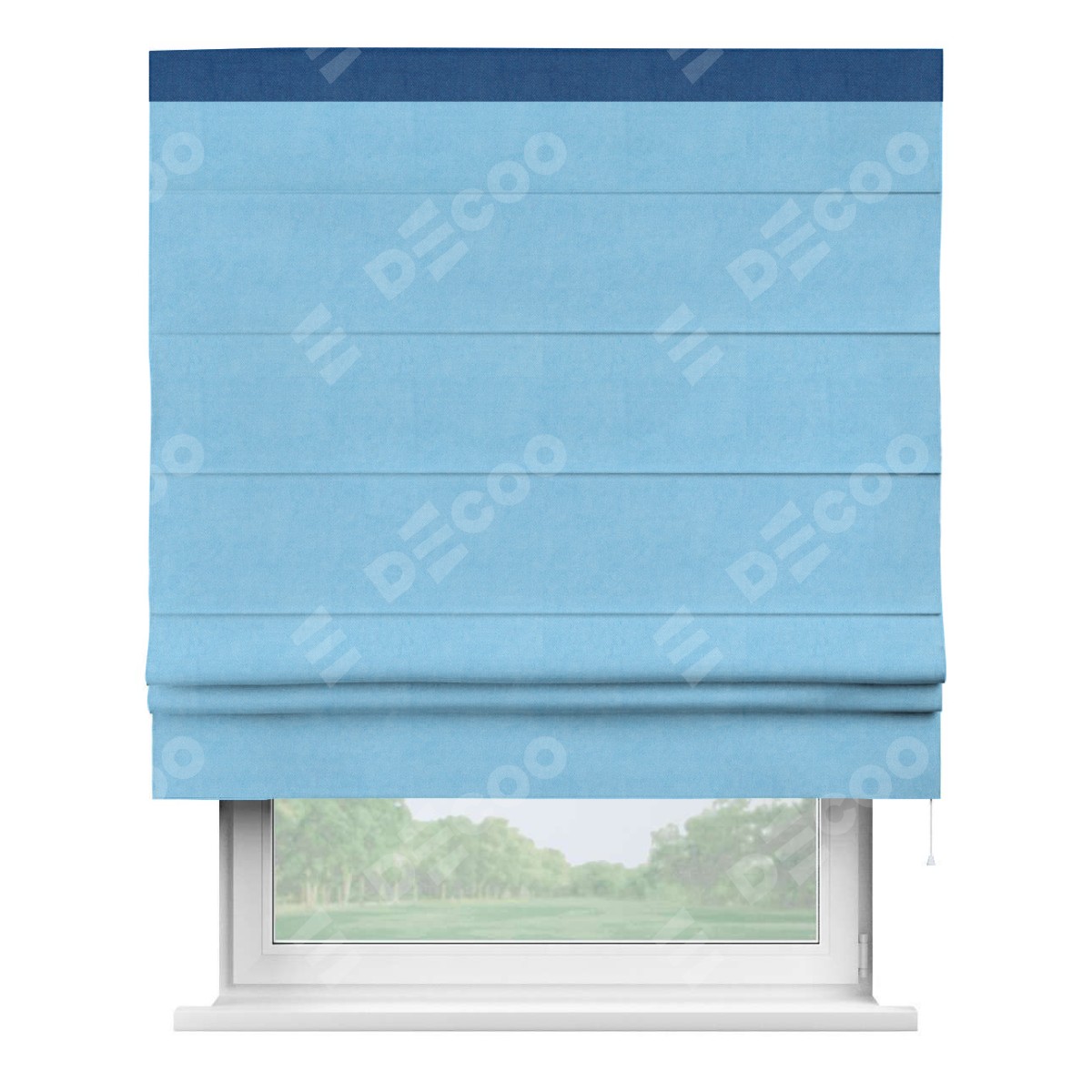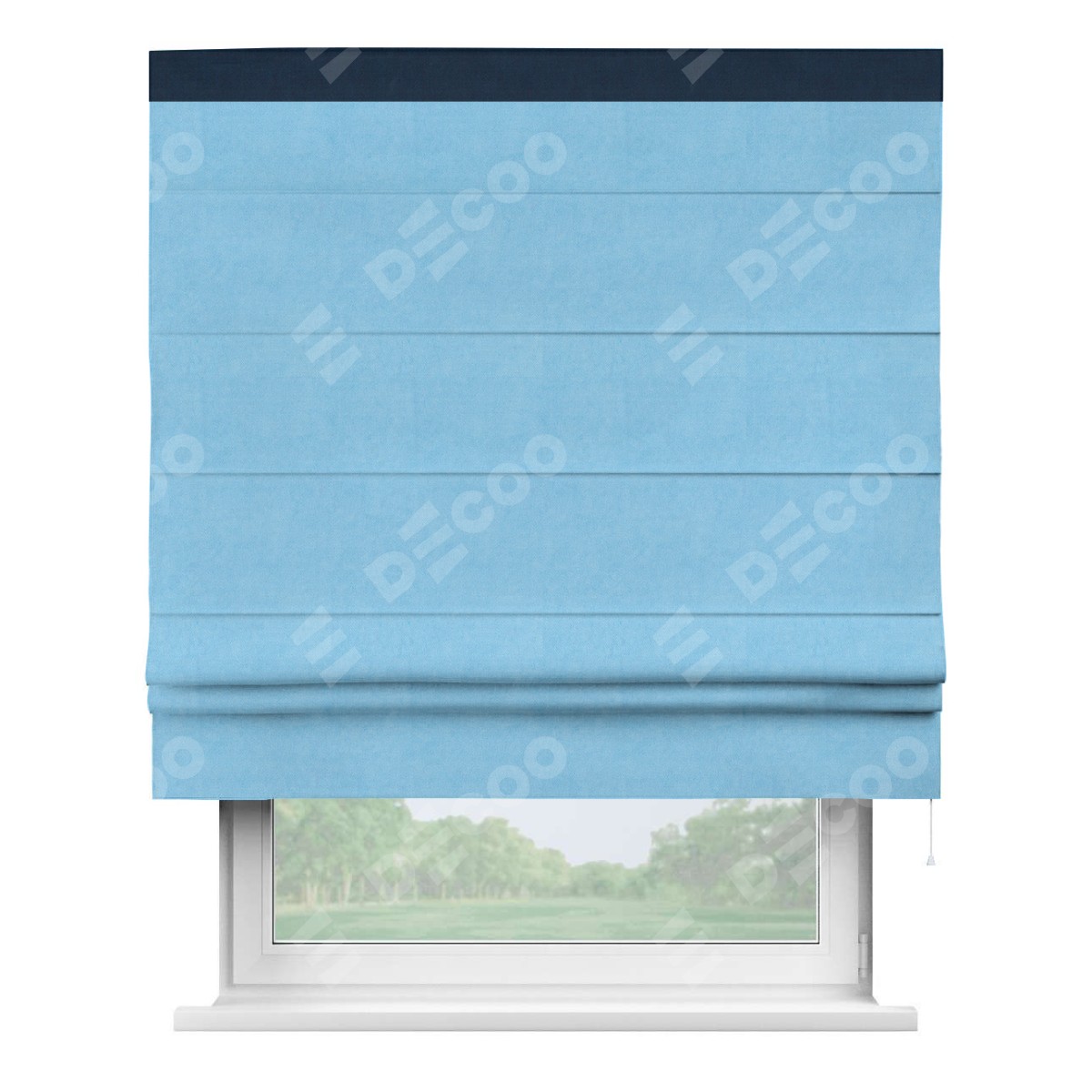 Римская штора производителя «Cortin», используется для проёма, пошита из ткани вельвет голубой, артикул ткани 85544. Отделка шторы кантом «Кинг», ткань для канта используется из вельвета разной расцветки на выбор. Имеет универсальный механизм и подходит для монтажа: на потолок, на стену и в нишу.