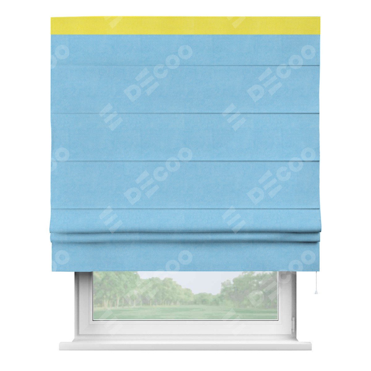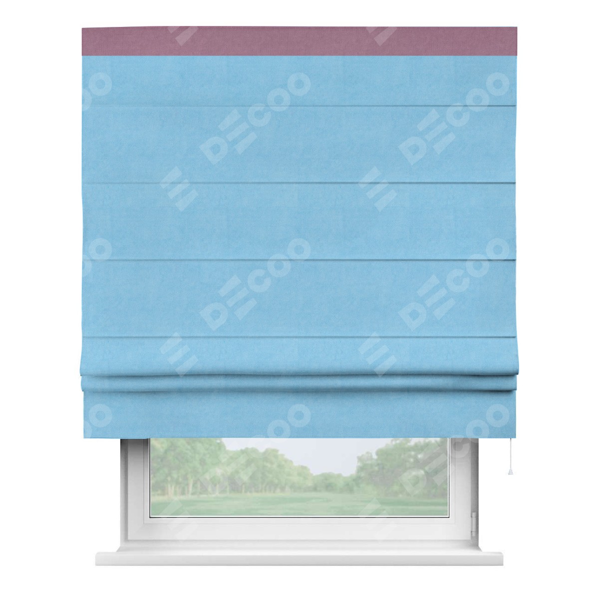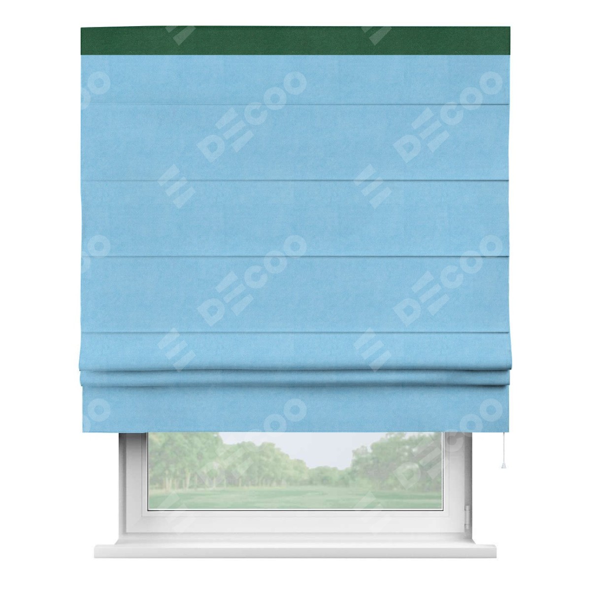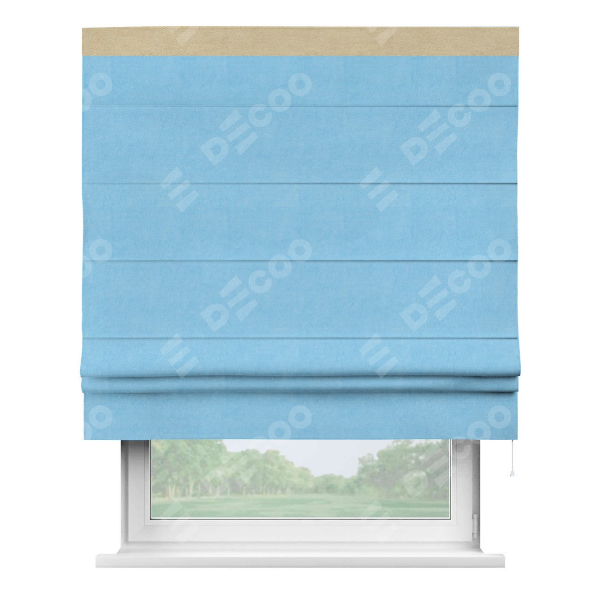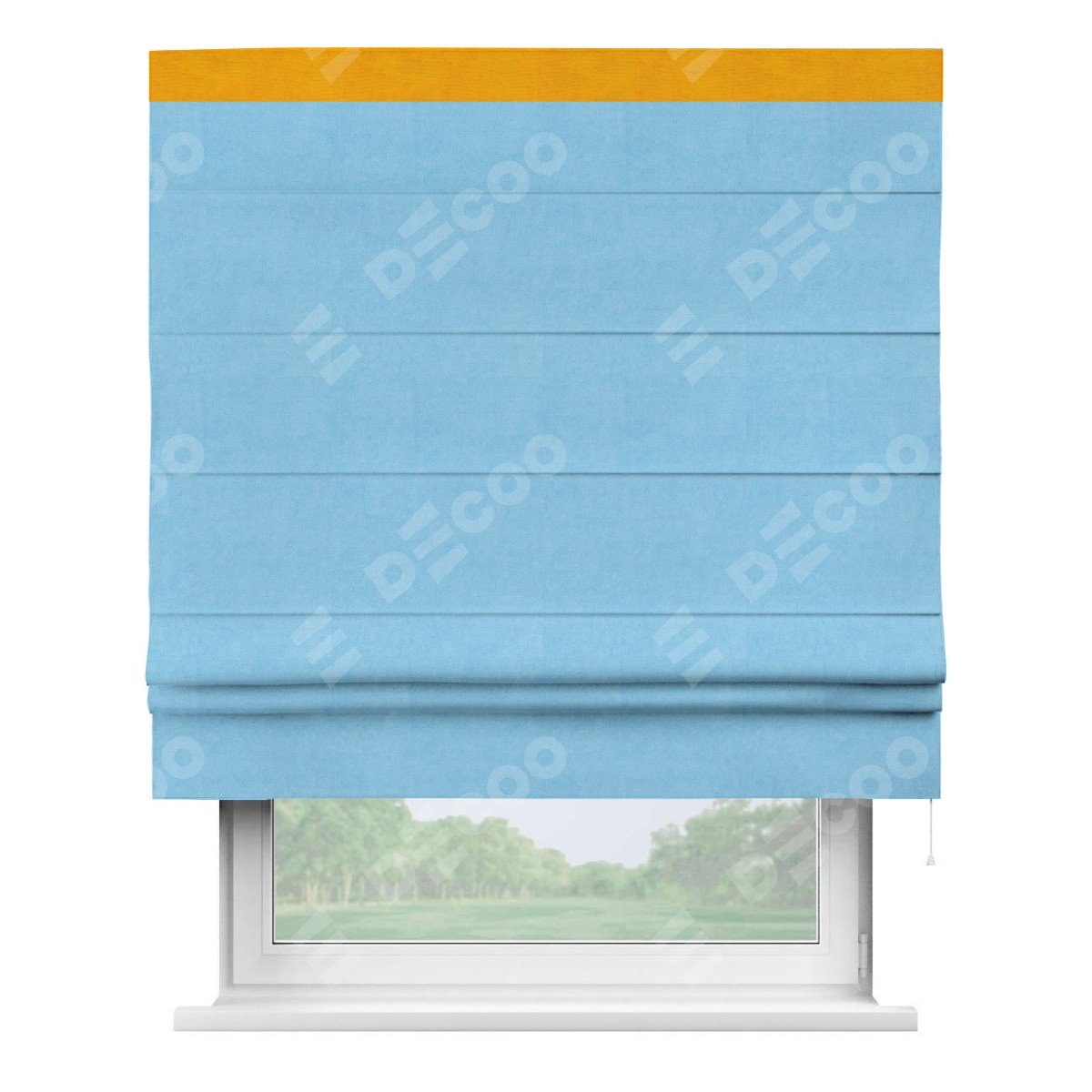 Римская штора производителя «Cortin», используется для проёма, пошита из ткани вельвет голубой, артикул ткани 85544. Отделка шторы кантом «Кинг», ткань для канта используется из вельвета разной расцветки на выбор. Имеет универсальный механизм и подходит для монтажа: на потолок, на стену и в нишу.