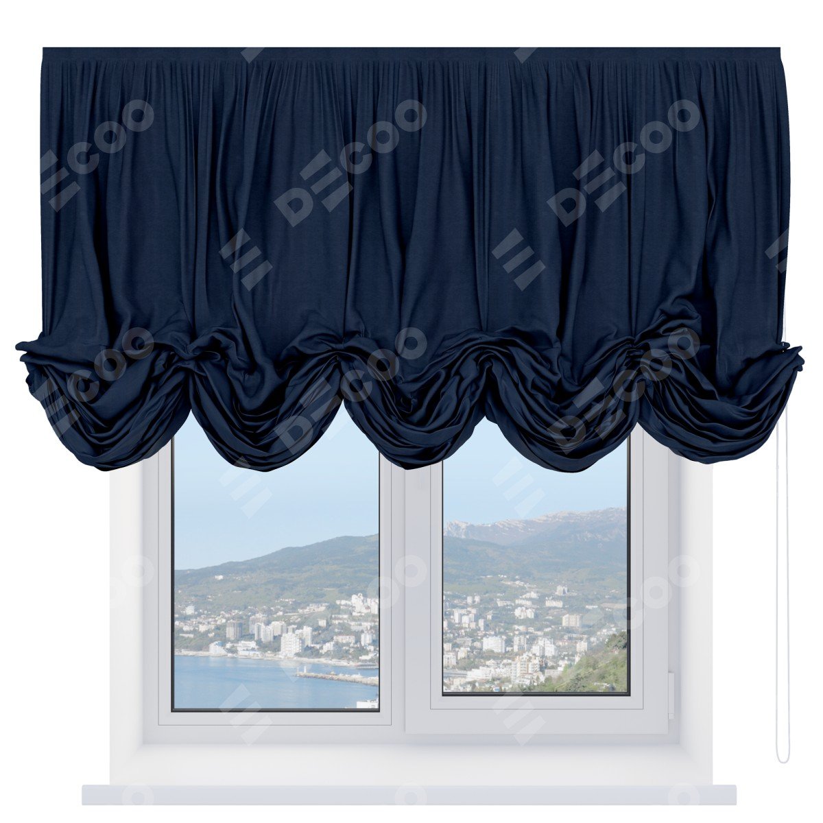 Австрийская штора производителя «Cortin», используется для проёма, пошита из ткани софт однотонный тёмно-синий, артикул ткани 33111. Имеет универсальный механизм и подходит для монтажа: на потолок и на стену.
