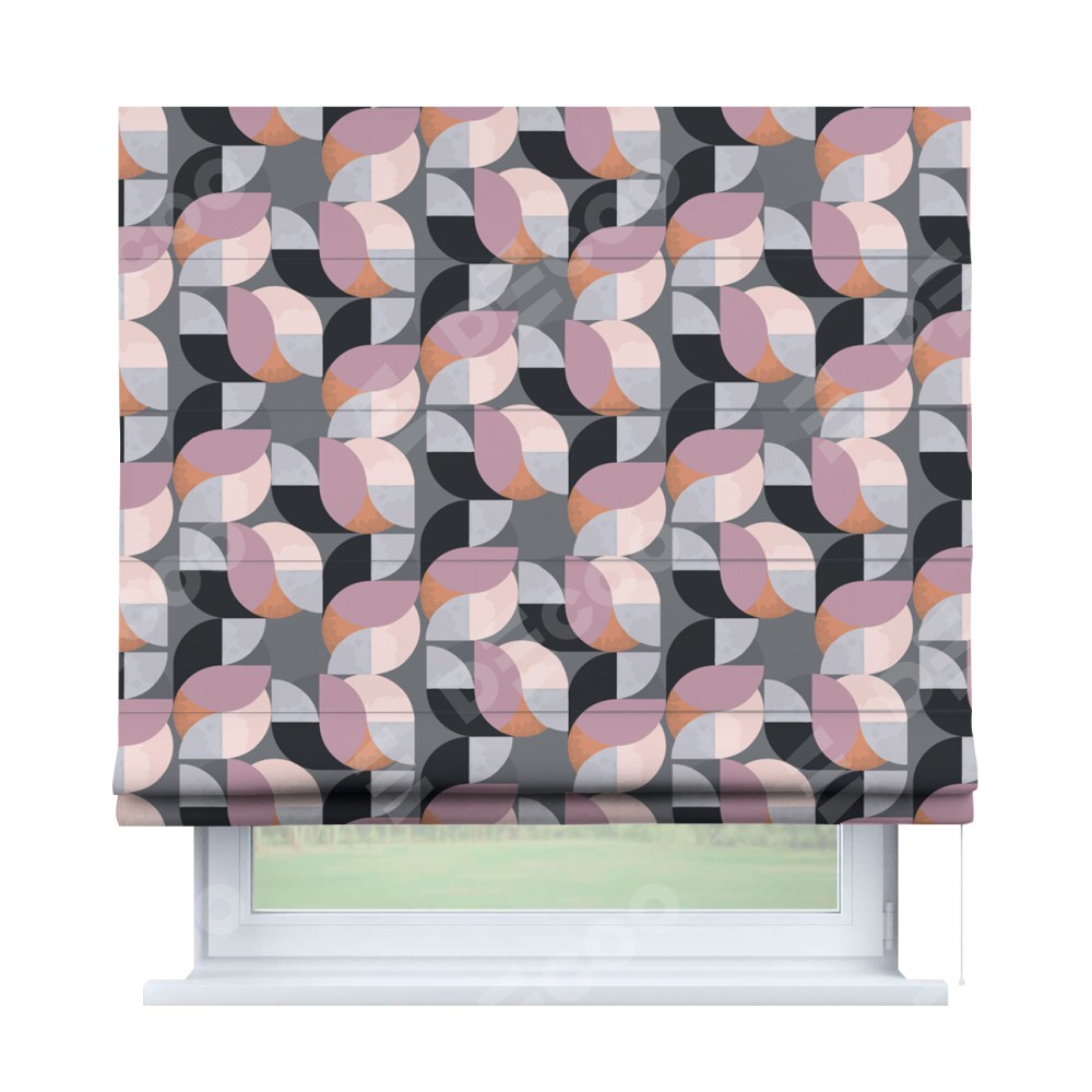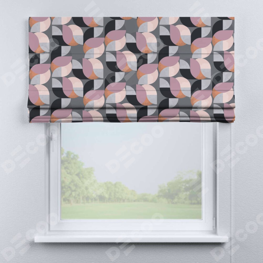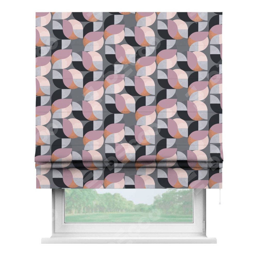 Римская штора производителя «Cortin», используется для проёма, пошита из ткани блэкаут с нанесением сублимационной печати «Абстрактный узор». Имеет универсальный механизм и подходит для монтажа: на потолок, на стену и в нишу.