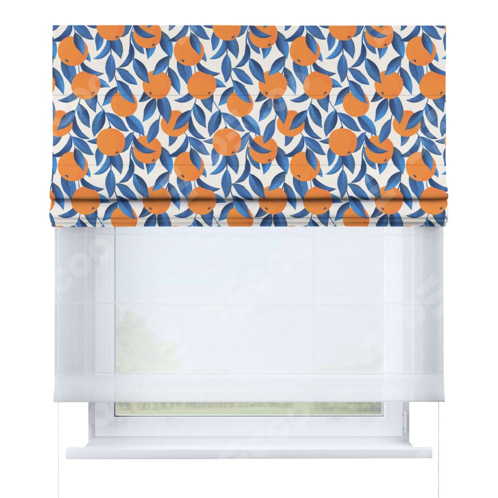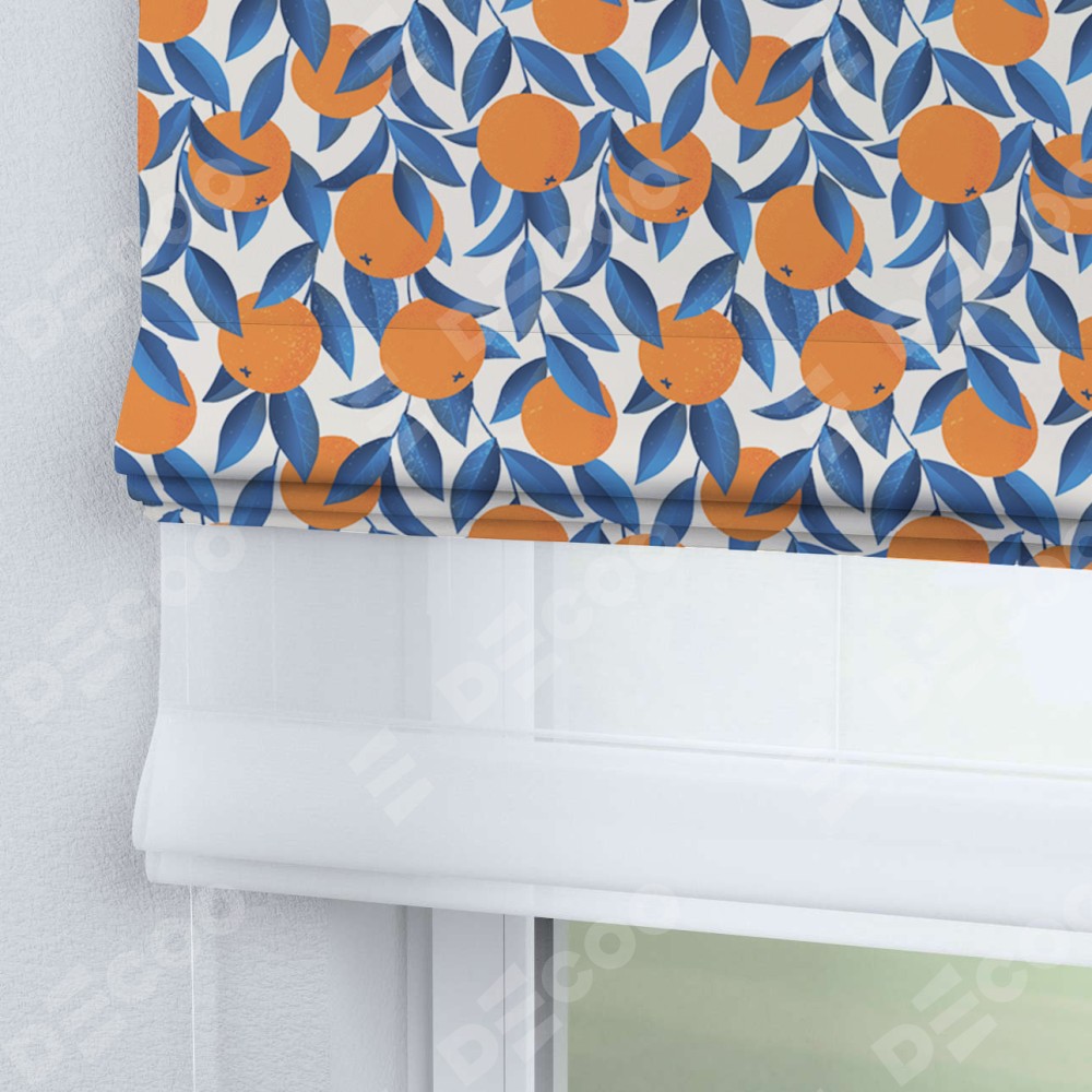 Римская штора день-ночь производителя «Cortin», используется для проёма, пошита из двух полотен, с лицевой блэкаут с нанесением сублимационной печати «Апельсиновое настроение», вторая ткань тюль (по стандарту комплектуется тюль белого цвета артикул V-01). Имеет универсальный механизм и подходит для монтажа: на потолок, на стену и в нишу.