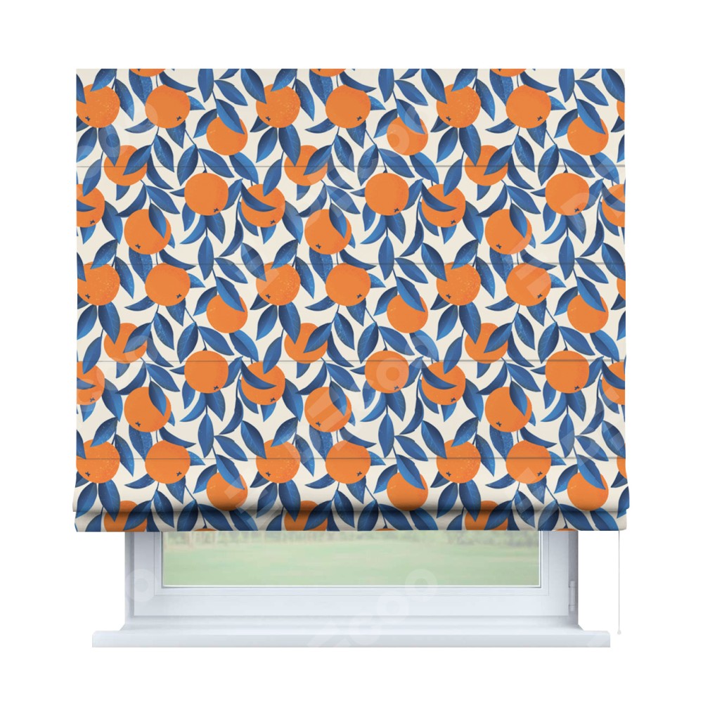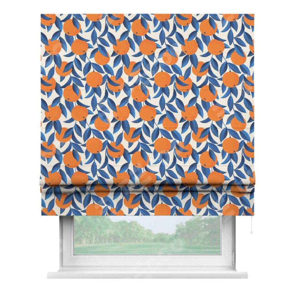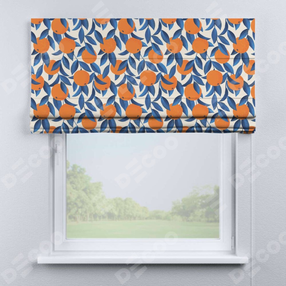 Римская штора производителя «Cortin», используется для проёма, пошита из ткани блэкаут с нанесением сублимационной печати «Апельсиновое настроение». Имеет универсальный механизм и подходит для монтажа: на потолок, на стену и в нишу.