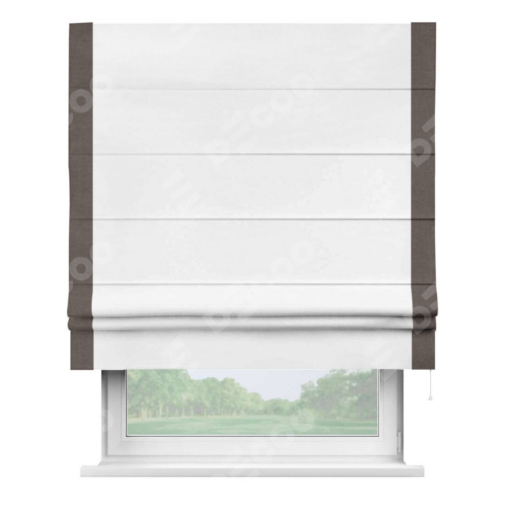 Римская штора производителя «Cortin», используется для проёма, пошита из ткани вельвет дымчато-белый, артикул ткани 85535. Отделка шторы кантом «Стрим Дуо», ткань для канта используется из вельвета разной расцветки на выбор. Имеет универсальный механизм и подходит для монтажа: на потолок, на стену и в нишу.