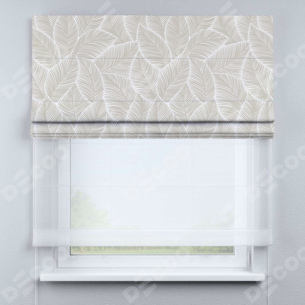 Римская штора день-ночь производителя «Cortin», используется для проёма, пошита из двух полотен, с лицевой блэкаут с нанесением сублимационной печати «Бежевые листья», вторая ткань тюль (по стандарту комплектуется тюль белого цвета артикул V-01). Имеет универсальный механизм и подходит для монтажа: на потолок, на стену и в нишу.